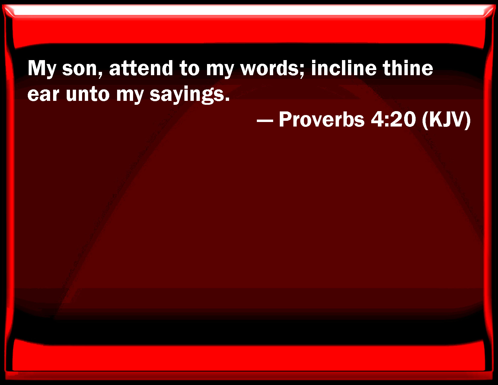 | | Bible Verse Slide  Proverbs 4:20 My son, attend to my words; incline your ear to my sayings. KJV:  My son, attend to my words; incline thine ear unto my sayings.