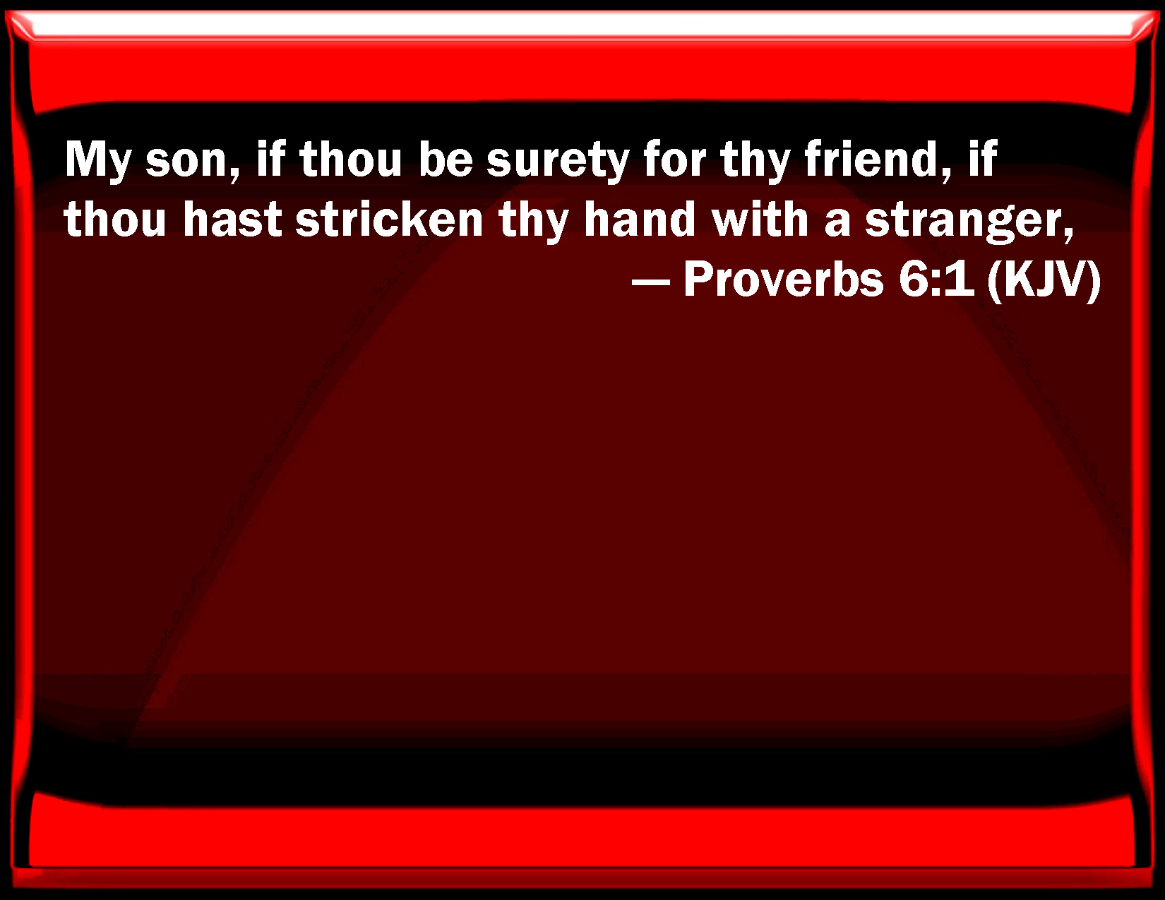 Bible Verse Slide Proverbs 6:1 My son, if you be surety for your friend, if you have stricken your hand with a stranger, KJV: My son, if thou be surety for thy friend, if thou hast stricken thy hand with a stranger, DRB: My son, if thou be surety for thy friend, thou hast engaged fast thy hand to a stranger. DBT: My son, if thou hast become surety for thy friend, if thou hast stricken thy hand for a stranger, ERV: My son, if thou art become surety for thy neighbour, if thou hast stricken thy hands for a stranger, WBT: My son, if thou art surety for thy friend, if thou hast stricken thy hand with a stranger, WEB: My son, if you have become collateral for your neighbor, if you have struck your hands in pledge for a stranger; YLT: My son! if thou hast been surety for thy friend, Hast stricken for a stranger thy hand,Links Proverbs 6:1 NIV • Proverbs 6:1 NLT • Proverbs 6:1 ESV • Proverbs 6:1 NASB • Proverbs 6:1 KJV • Proverbs 6:1 Interlinear • Proverbs 6:1 Commentaries • Proverbs 6:1 Parallel Texts • Proverbs 6:1 Bible Apps • Proverbs 6:1 Parallel • Bible Hub |