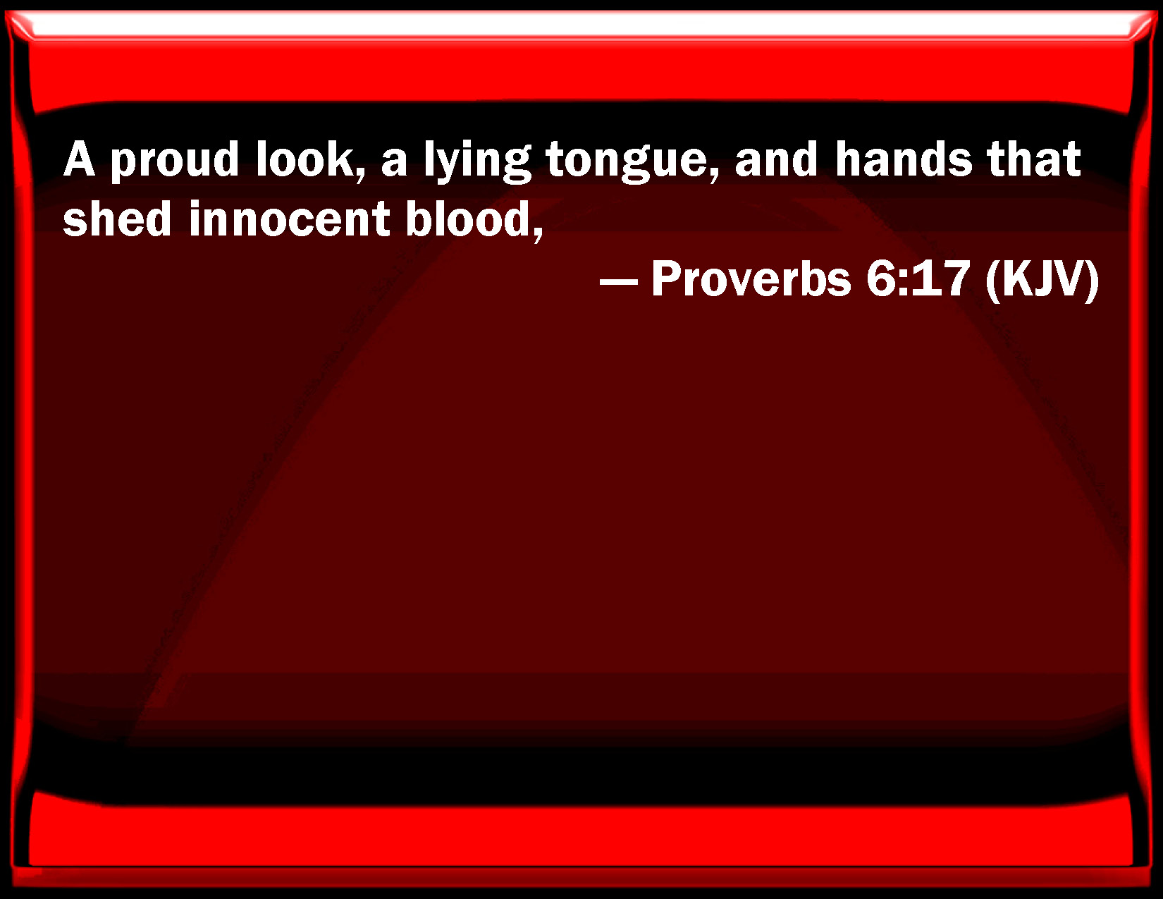 Bible Verse Slide Proverbs 6:17 A proud look, a lying tongue, and hands that shed innocent blood, KJV: A proud look, a lying tongue, and hands that shed innocent blood, DRB: Haughty eyes, a lying tongue, hands that shed innocent blood, DBT: haughty eyes, a lying tongue, and hands that shed innocent blood; ERV: Haughty eyes, a lying tongue, and hands that shed innocent blood; WBT: A proud look, a lying tongue, and hands that shed innocent blood. WEB: haughty eyes, a lying tongue, hands that shed innocent blood; YLT: Eyes high — tongues false — And hands shedding innocent blood — Links Proverbs 6:17 NIV • Proverbs 6:17 NLT • Proverbs 6:17 ESV • Proverbs 6:17 NASB • Proverbs 6:17 KJV • Proverbs 6:17 Interlinear • Proverbs 6:17 Commentaries • Proverbs 6:17 Parallel Texts • Proverbs 6:17 Bible Apps • Proverbs 6:17 Parallel • Bible Hub |