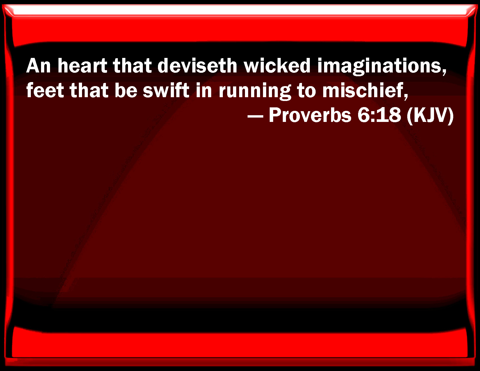 Bible Verse Slide Proverbs 6:18 An heart that devises wicked imaginations, feet that be swift in running to mischief, KJV: An heart that deviseth wicked imaginations, feet that be swift in running to mischief, DRB: A heart that deviseth wicked plots, feet that are swift to run into mischief, DBT: a heart that deviseth wicked imaginations; feet that are swift in running to mischief; ERV: An heart that deviseth wicked imaginations, feet that be swift in running to mischief; WBT: A heart that deviseth wicked imaginations, feet that are swift in running to mischief, WEB: a heart that devises wicked schemes, feet that are swift in running to mischief, YLT: A heart devising thoughts of vanity — Feet hasting to run to evil — Links Proverbs 6:18 NIV • Proverbs 6:18 NLT • Proverbs 6:18 ESV • Proverbs 6:18 NASB • Proverbs 6:18 KJV • Proverbs 6:18 Interlinear • Proverbs 6:18 Commentaries • Proverbs 6:18 Parallel Texts • Proverbs 6:18 Bible Apps • Proverbs 6:18 Parallel • Bible Hub |