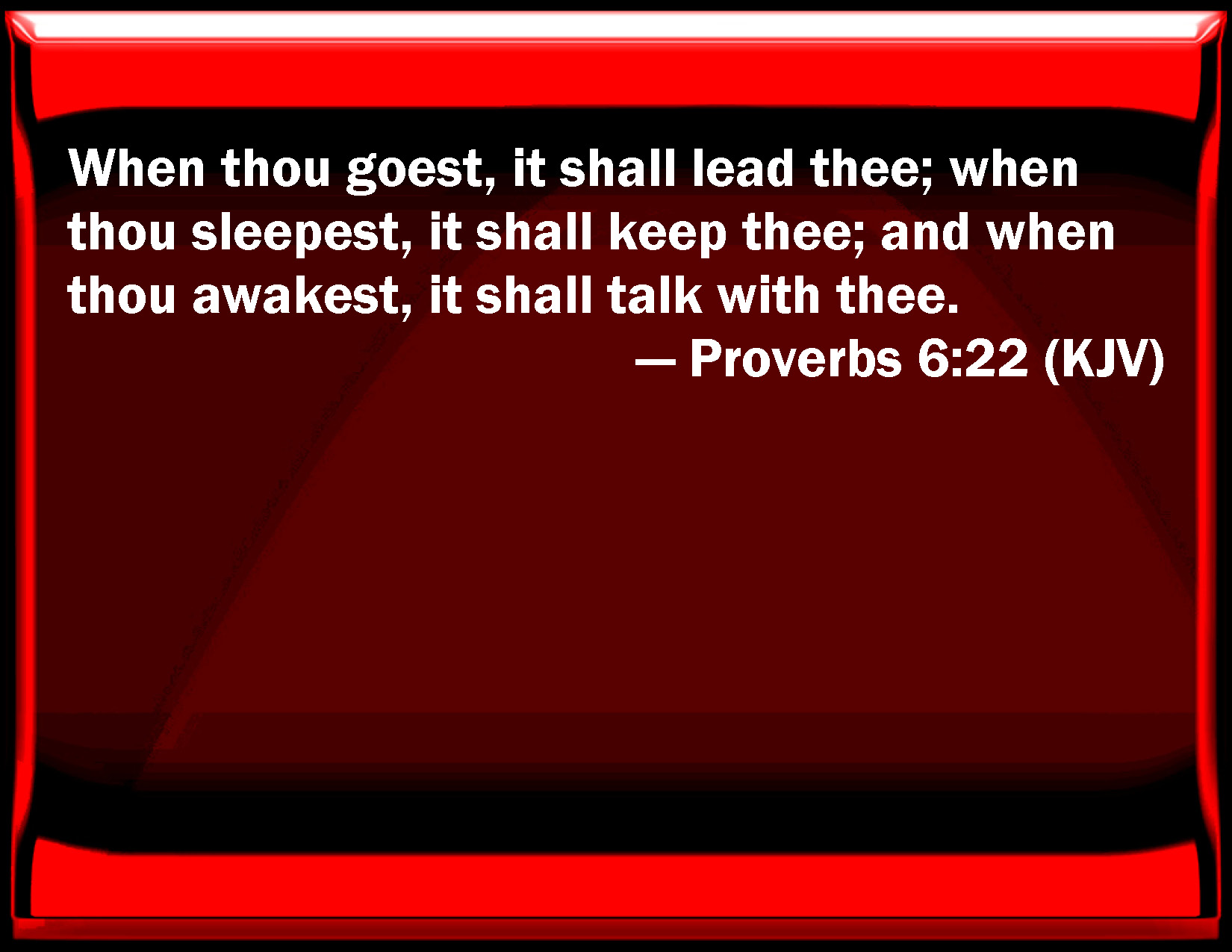 Bible Verse Slide Proverbs 6:22 When you go, it shall lead you; when you sleep, it shall keep you; and when you wake, it shall talk with you. KJV: When thou goest, it shall lead thee; when thou sleepest, it shall keep thee; and when thou awakest, it shall talk with thee. DRB: When thou walkest, let them go with thee: when thou sleepest, let them keep thee; and when thou awakest, talk with them. DBT: when thou walkest, it shall lead thee; when thou sleepest, it shall keep thee; and when thou awakest, it shall talk with thee. ERV: When thou walkest, it shall lead thee; when thou sleepest, it shall watch over thee; and when thou awakest, it shall talk with thee. WBT: When thou goest, it shall lead thee; when thou sleepest, it shall keep thee; and when thou awakest, it shall talk with thee. WEB: When you walk, it will lead you. When you sleep, it will watch over you. When you awake, it will talk with you. YLT: In thy going up and down, it leadeth thee, In thy lying down, it watcheth over thee, And thou hast awaked — it talketh with thee.Links Proverbs 6:22 NIV • Proverbs 6:22 NLT • Proverbs 6:22 ESV • Proverbs 6:22 NASB • Proverbs 6:22 KJV • Proverbs 6:22 Interlinear • Proverbs 6:22 Commentaries • Proverbs 6:22 Parallel Texts • Proverbs 6:22 Bible Apps • Proverbs 6:22 Parallel • Bible Hub |