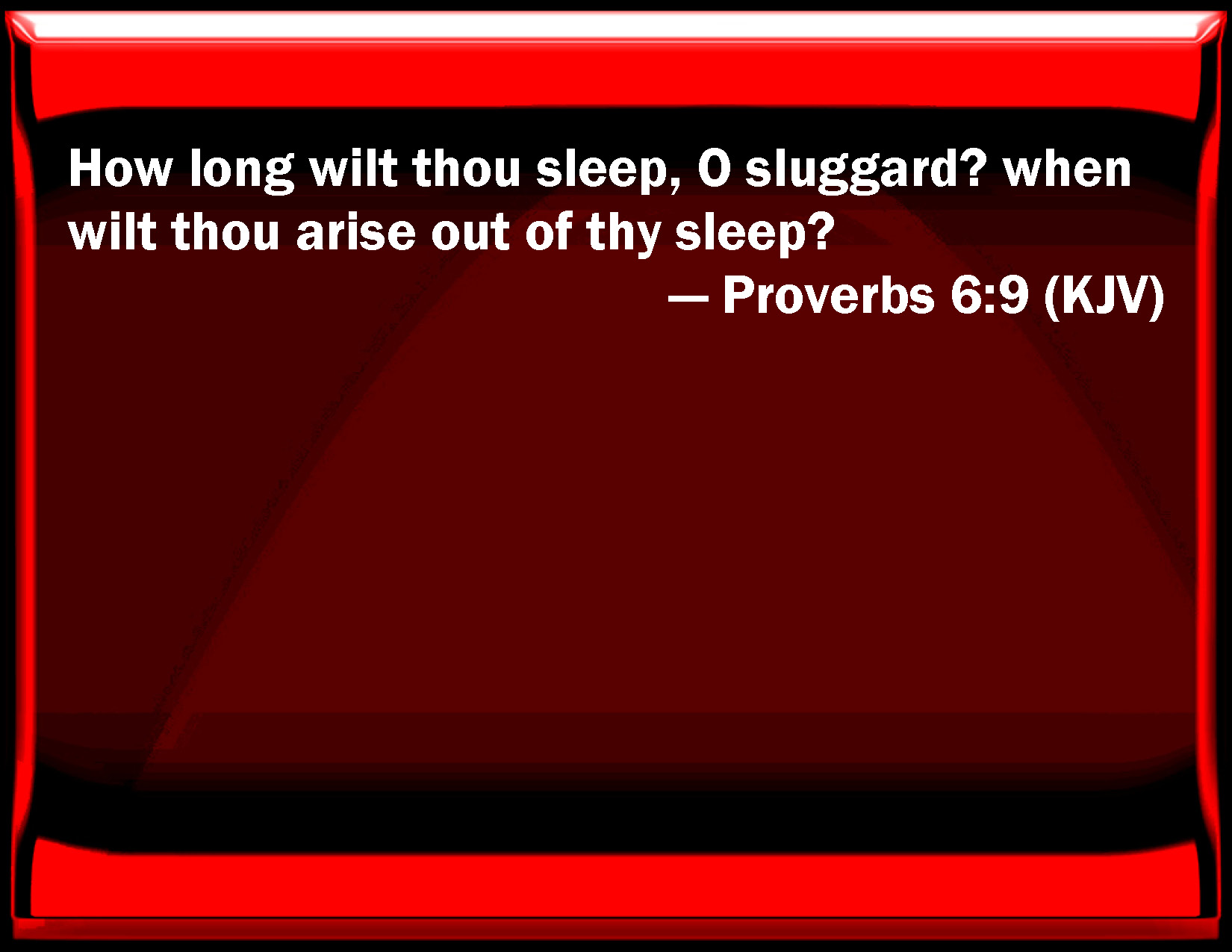 Bible Verse Slide Proverbs 6:9 How long will you sleep, O sluggard? when will you arise out of your sleep? KJV: How long wilt thou sleep, O sluggard? when wilt thou arise out of thy sleep? DRB: How long wilt thou sleep, O sluggard? when wilt thou rise out of thy sleep? DBT: How long, sluggard, wilt thou lie down? When wilt thou arise out of thy sleep? ERV: How long wilt thou sleep, O sluggard? when wilt thou arise out of thy sleep? WBT: How long wilt thou sleep, O sluggard? when wilt thou arise out of thy sleep? WEB: How long will you sleep, sluggard? When will you arise out of your sleep? YLT: Till when, O slothful one, dost thou lie? When dost thou arise from thy sleep?Links Proverbs 6:9 NIV • Proverbs 6:9 NLT • Proverbs 6:9 ESV • Proverbs 6:9 NASB • Proverbs 6:9 KJV • Proverbs 6:9 Interlinear • Proverbs 6:9 Commentaries • Proverbs 6:9 Parallel Texts • Proverbs 6:9 Bible Apps • Proverbs 6:9 Parallel • Bible Hub |