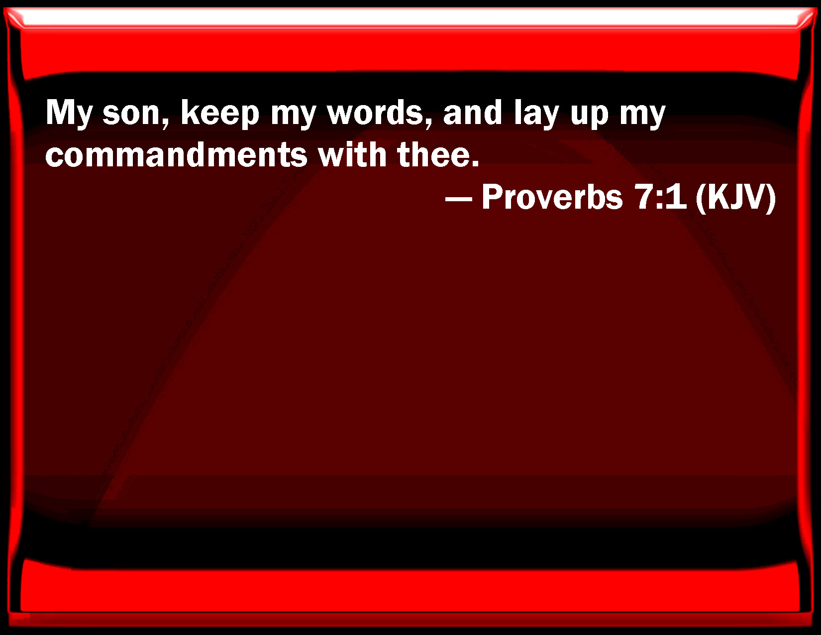 Bible Verse Slide Proverbs 7:1 My son, keep my words, and lay up my commandments with you. KJV: My son, keep my words, and lay up my commandments with thee. DRB: My son, keep my words, and lay up my precepts with thee. Son, DBT: My son, keep my words, and lay up my commandments with thee. ERV: My son, keep my words, and lay up my commandments with thee. WBT: My son, keep my words, and lay up my commandments with thee. WEB: My son, keep my words. Lay up my commandments within you. YLT: My son! keep my sayings, And my commands lay up with thee.Links Proverbs 7:1 NIV • Proverbs 7:1 NLT • Proverbs 7:1 ESV • Proverbs 7:1 NASB • Proverbs 7:1 KJV • Proverbs 7:1 Interlinear • Proverbs 7:1 Commentaries • Proverbs 7:1 Parallel Texts • Proverbs 7:1 Bible Apps • Proverbs 7:1 Parallel • Bible Hub |
