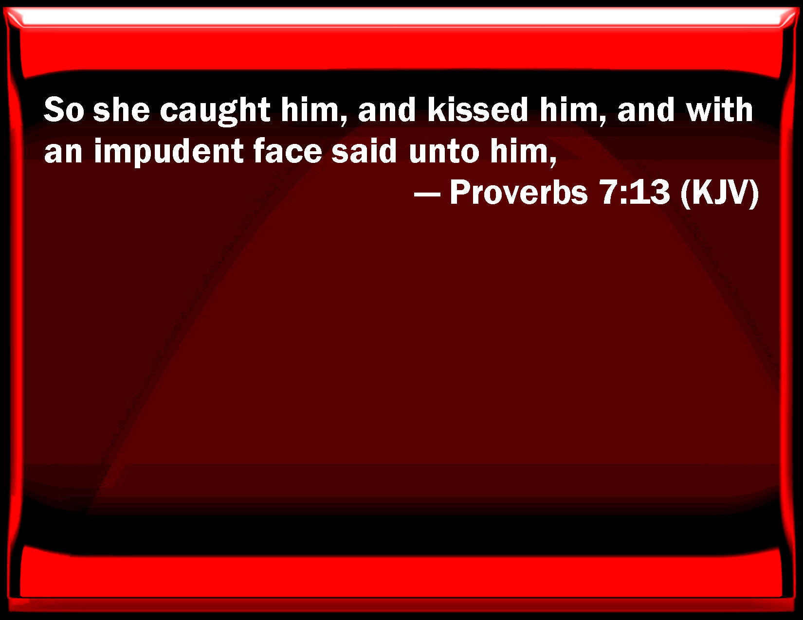 Bible Verse Slide Proverbs 7:13 So she caught him, and kissed him, and with an impudent face said to him, KJV: So she caught him, and kissed him, and with an impudent face said unto him, DRB: And catching the young man, she kisseth him, and with an impudent face, flattereth, saying: DBT: And she caught him and kissed him, and with an impudent face said unto him, ERV: So she caught him, and kissed him, and with an impudent face she said unto him: WBT: So she caught him, and kissed him, and with an impudent face said to him, WEB: So she caught him, and kissed him. With an impudent face she said to him: YLT: And she laid hold on him, and kissed him, She hath hardened her face, and saith to him,Links Proverbs 7:13 NIV • Proverbs 7:13 NLT • Proverbs 7:13 ESV • Proverbs 7:13 NASB • Proverbs 7:13 KJV • Proverbs 7:13 Interlinear • Proverbs 7:13 Commentaries • Proverbs 7:13 Parallel Texts • Proverbs 7:13 Bible Apps • Proverbs 7:13 Parallel • Bible Hub |