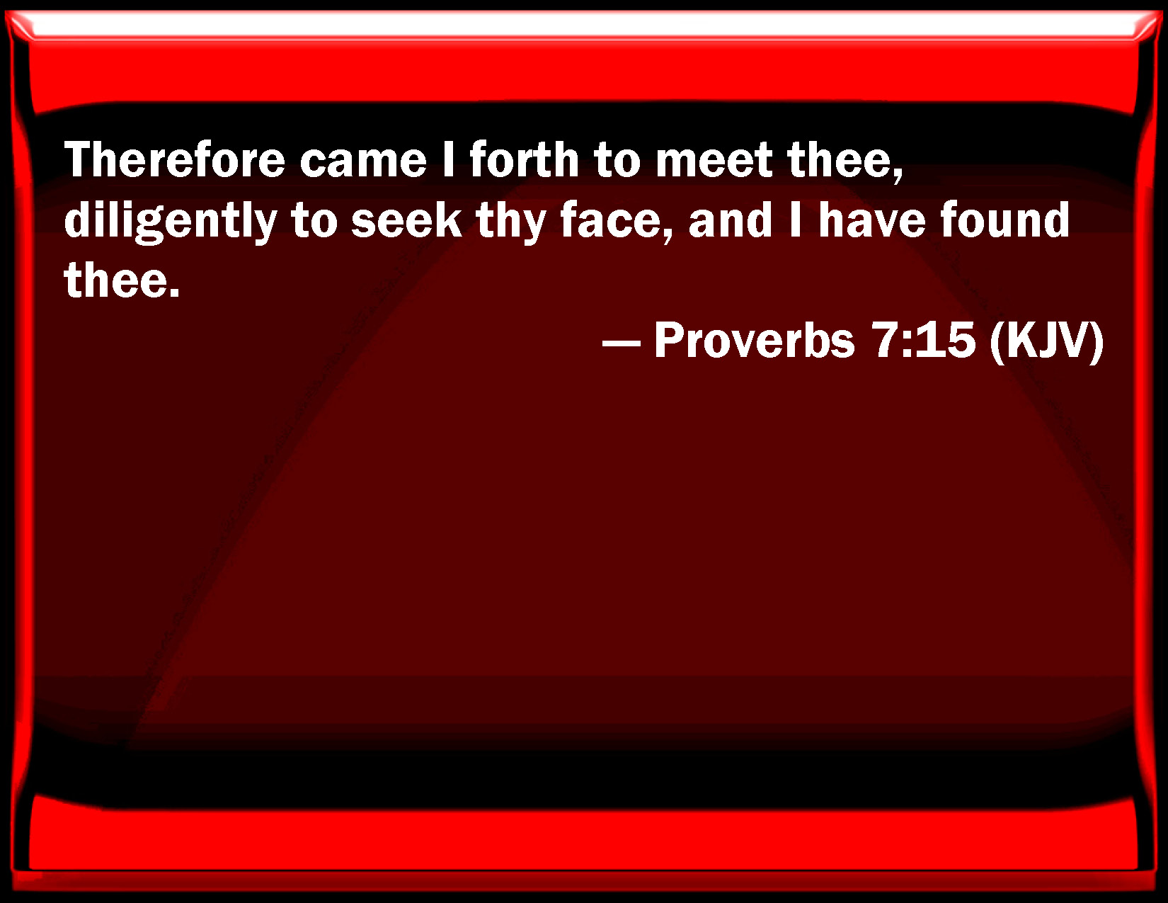Bible Verse Slide Proverbs 7:15 Therefore came I forth to meet you, diligently to seek your face, and I have found you. KJV: Therefore came I forth to meet thee, diligently to seek thy face, and I have found thee. DRB: Therefore I am come out to meet thee, desirous to see thee, and I have found thee. DBT: therefore came I forth to meet thee, to seek earnestly thy face, and I have found thee. ERV: Therefore came I forth to meet thee, diligently to seek thy face, and I have found thee. WBT: Therefore I came forth to meet thee, diligently to seek thy face, and I have found thee. WEB: Therefore I came out to meet you, to diligently seek your face, and I have found you. YLT: Therefore I have come forth to meet thee, To seek earnestly thy face, and I find thee.Links Proverbs 7:15 NIV • Proverbs 7:15 NLT • Proverbs 7:15 ESV • Proverbs 7:15 NASB • Proverbs 7:15 KJV • Proverbs 7:15 Interlinear • Proverbs 7:15 Commentaries • Proverbs 7:15 Parallel Texts • Proverbs 7:15 Bible Apps • Proverbs 7:15 Parallel • Bible Hub |