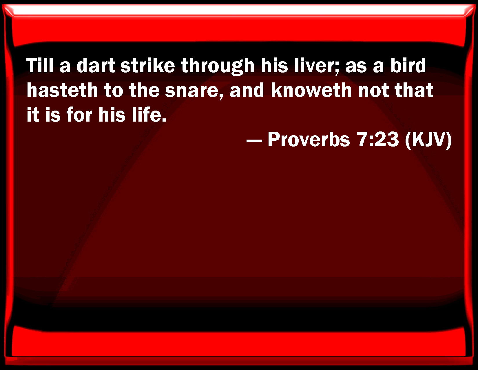 Bible Verse Slide Proverbs 7:23 Till a dart strike through his liver; as a bird hastens to the snare, and knows not that it is for his life. KJV: Till a dart strike through his liver; as a bird hasteth to the snare, and knoweth not that it is for his life. DRB: Till the arrow pierce his liver: as if a bird should make haste to the snare, and knoweth not that his life is in danger. DBT: till an arrow strike through his liver: as a bird hasteth to the snare, and knoweth not that it is for its life. ERV: Till an arrow strike through his liver; as a bird hasteth to the snare, and knoweth not that it is for his life. WBT: Till a dart striketh through his liver; as a bird hasteth to the snare, and knoweth not that it is for his life. WEB: Until an arrow strikes through his liver, as a bird hurries to the snare, and doesn't know that it will cost his life. YLT: Till an arrow doth split his liver, As a bird hath hastened unto a snare, And hath not known that it is for its life.Links Proverbs 7:23 NIV • Proverbs 7:23 NLT • Proverbs 7:23 ESV • Proverbs 7:23 NASB • Proverbs 7:23 KJV • Proverbs 7:23 Interlinear • Proverbs 7:23 Commentaries • Proverbs 7:23 Parallel Texts • Proverbs 7:23 Bible Apps • Proverbs 7:23 Parallel • Bible Hub |