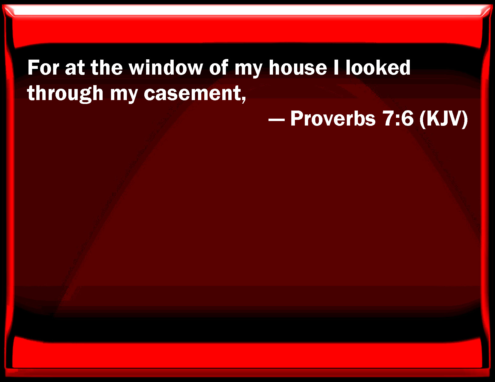 Bible Verse Slide Proverbs 7:6 For at the window of my house I looked through my casement, KJV: For at the window of my house I looked through my casement, DRB: For I look out of the window of my house through the lattice, DBT: For at the window of my house, I looked forth through my lattice, ERV: For at the window of my house I looked forth through my lattice; WBT: For at the window of my house I looked through my casement, WEB: For at the window of my house, I looked out through my lattice. YLT: For, at a window of my house, Through my casement I have looked out,Links Proverbs 7:6 NIV • Proverbs 7:6 NLT • Proverbs 7:6 ESV • Proverbs 7:6 NASB • Proverbs 7:6 KJV • Proverbs 7:6 Interlinear • Proverbs 7:6 Commentaries • Proverbs 7:6 Parallel Texts • Proverbs 7:6 Bible Apps • Proverbs 7:6 Parallel • Bible Hub |