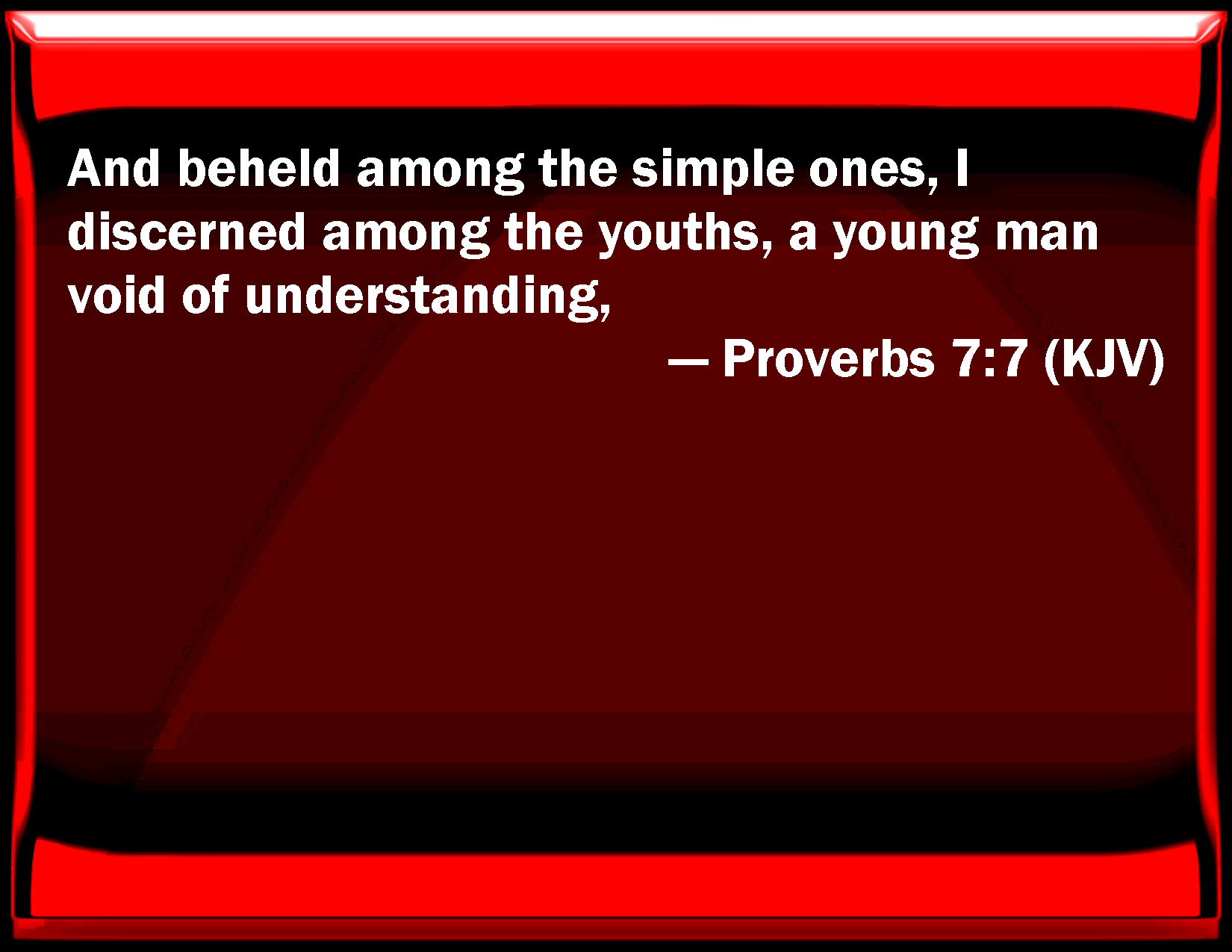 Bible Verse Slide Proverbs 7:7 And beheld among the simple ones, I discerned among the youths, a young man void of understanding, KJV: And beheld among the simple ones, I discerned among the youths, a young man void of understanding, DRB: And I see little ones, I behold a foolish young man, DBT: and I beheld among the simple ones, I discerned among the sons, a young man void of understanding, ERV: And I beheld among the simple ones, I discerned among the youths, a young man void of understanding, WBT: And beheld among the simple ones, I discerned among the youths, a young man void of understanding, WEB: I saw among the simple ones. I discerned among the youths a young man void of understanding, YLT: And I do see among the simple ones, I discern among the sons, A young man lacking understanding,Links Proverbs 7:7 NIV • Proverbs 7:7 NLT • Proverbs 7:7 ESV • Proverbs 7:7 NASB • Proverbs 7:7 KJV • Proverbs 7:7 Interlinear • Proverbs 7:7 Commentaries • Proverbs 7:7 Parallel Texts • Proverbs 7:7 Bible Apps • Proverbs 7:7 Parallel • Bible Hub |