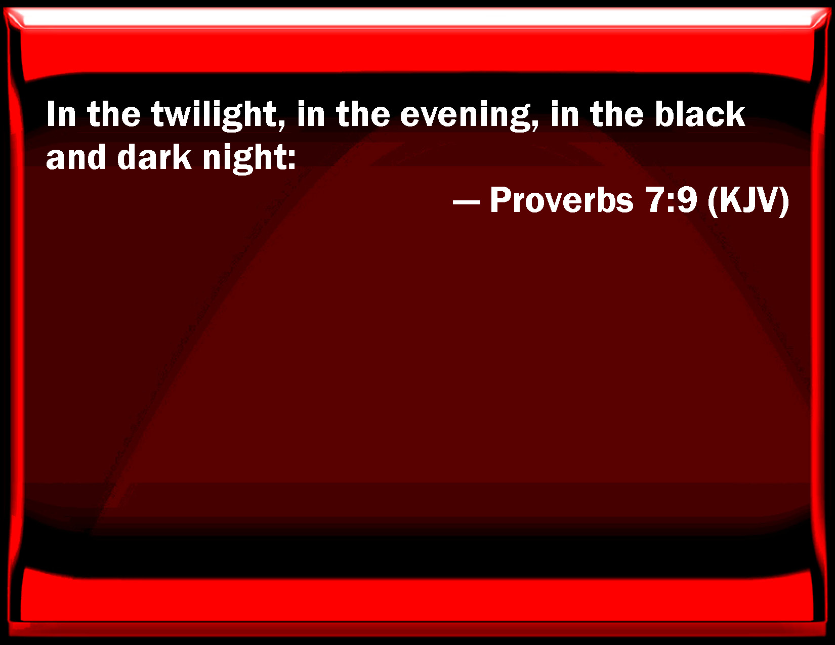 Bible Verse Slide Proverbs 7:9 In the twilight, in the evening, in the black and dark night: KJV: In the twilight, in the evening, in the black and dark night: DRB: In the dark, when it grows late, in the darkness and obscurity of the night, DBT: in the twilight, in the evening of the day, in the blackness of night and the darkness. ERV: In the twilight, in the evening of the day, in the blackness of night and the darkness. WBT: In the twilight, in the evening, in the black and dark night: WEB: in the twilight, in the evening of the day, in the middle of the night and in the darkness. YLT: In the twilight — in the evening of day, In the darkness of night and blackness.Links Proverbs 7:9 NIV • Proverbs 7:9 NLT • Proverbs 7:9 ESV • Proverbs 7:9 NASB • Proverbs 7:9 KJV • Proverbs 7:9 Interlinear • Proverbs 7:9 Commentaries • Proverbs 7:9 Parallel Texts • Proverbs 7:9 Bible Apps • Proverbs 7:9 Parallel • Bible Hub |