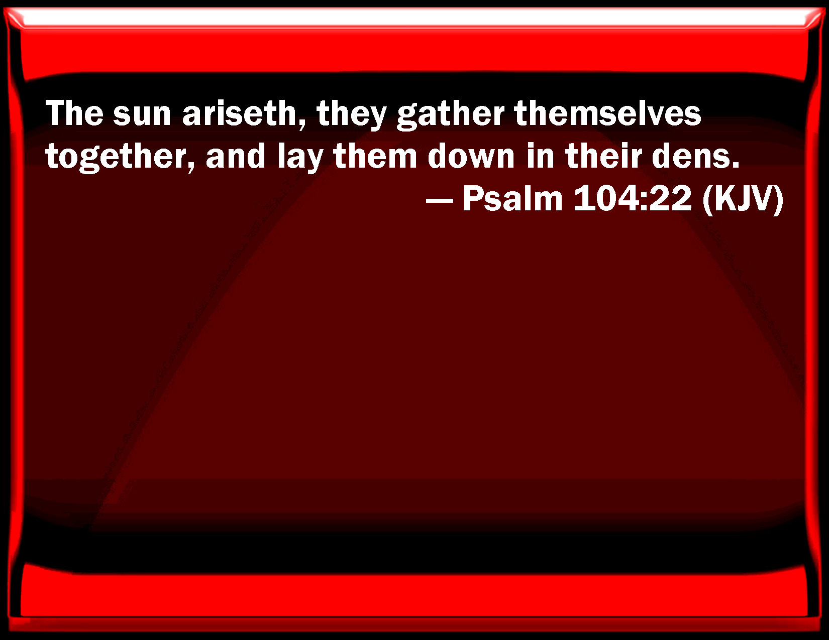 Bible Verse Slide Psalm 104:22 The sun rises, they gather themselves together, and lay them down in their dens. KJV: The sun ariseth, they gather themselves together, and lay them down in their dens. DRB: The sun ariseth, and they are gathered together: and they shall lie down in their dens. DBT: The sun ariseth, they retreat, and lay them down in their dens. ERV: The sun ariseth, they get them away, and lay them down in their dens. WBT: The sun ariseth, they collect, and lay themselves down in their dens. WEB: The sun rises, and they steal away, and lay down in their dens. YLT: The sun riseth, they are gathered, And in their dens they crouch.Links Psalm 104:22 NIV • Psalm 104:22 NLT • Psalm 104:22 ESV • Psalm 104:22 NASB • Psalm 104:22 KJV • Psalm 104:22 Interlinear • Psalm 104:22 Commentaries • Psalm 104:22 Parallel Texts • Psalm 104:22 Bible Apps • Psalm 104:22 Parallel • Bible Hub |