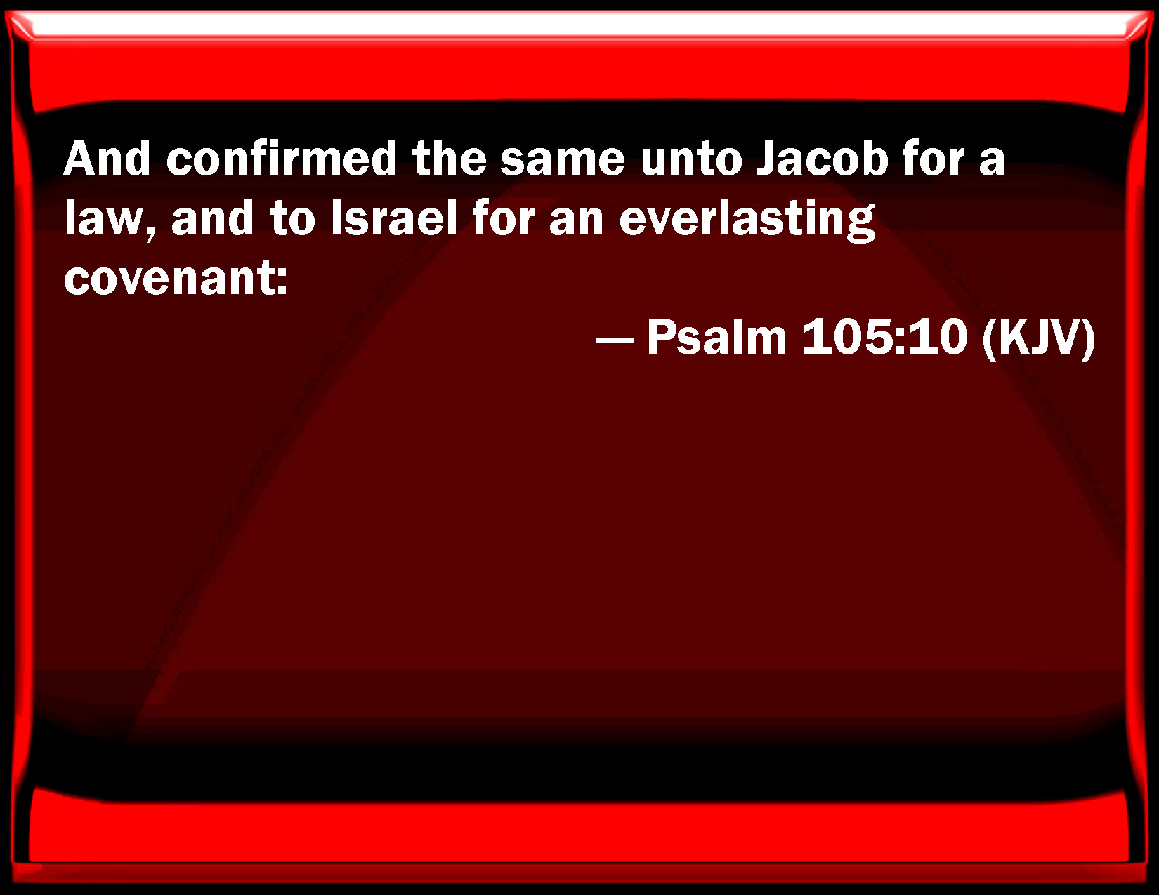 Bible Verse Slide Psalm 105:10 And confirmed the same to Jacob for a law, and to Israel for an everlasting covenant: KJV: And confirmed the same unto Jacob for a law, and to Israel for an everlasting covenant: DRB: And he appointed the same to Jacob for a law, and to Israel for an everlasting testament: DBT: And he confirmed it unto Jacob for a statute, unto Israel for an everlasting covenant, ERV: And confirmed the same unto Jacob for a statute, to Israel for an everlasting covenant: WBT: And confirmed the same to Jacob for a law, and to Israel for an everlasting covenant: WEB: and confirmed the same to Jacob for a statute; to Israel for an everlasting covenant, YLT: And doth establish it to Jacob for a statute, To Israel — a covenant age-during,Links Psalm 105:10 NIV • Psalm 105:10 NLT • Psalm 105:10 ESV • Psalm 105:10 NASB • Psalm 105:10 KJV • Psalm 105:10 Interlinear • Psalm 105:10 Commentaries • Psalm 105:10 Parallel Texts • Psalm 105:10 Bible Apps • Psalm 105:10 Parallel • Bible Hub |