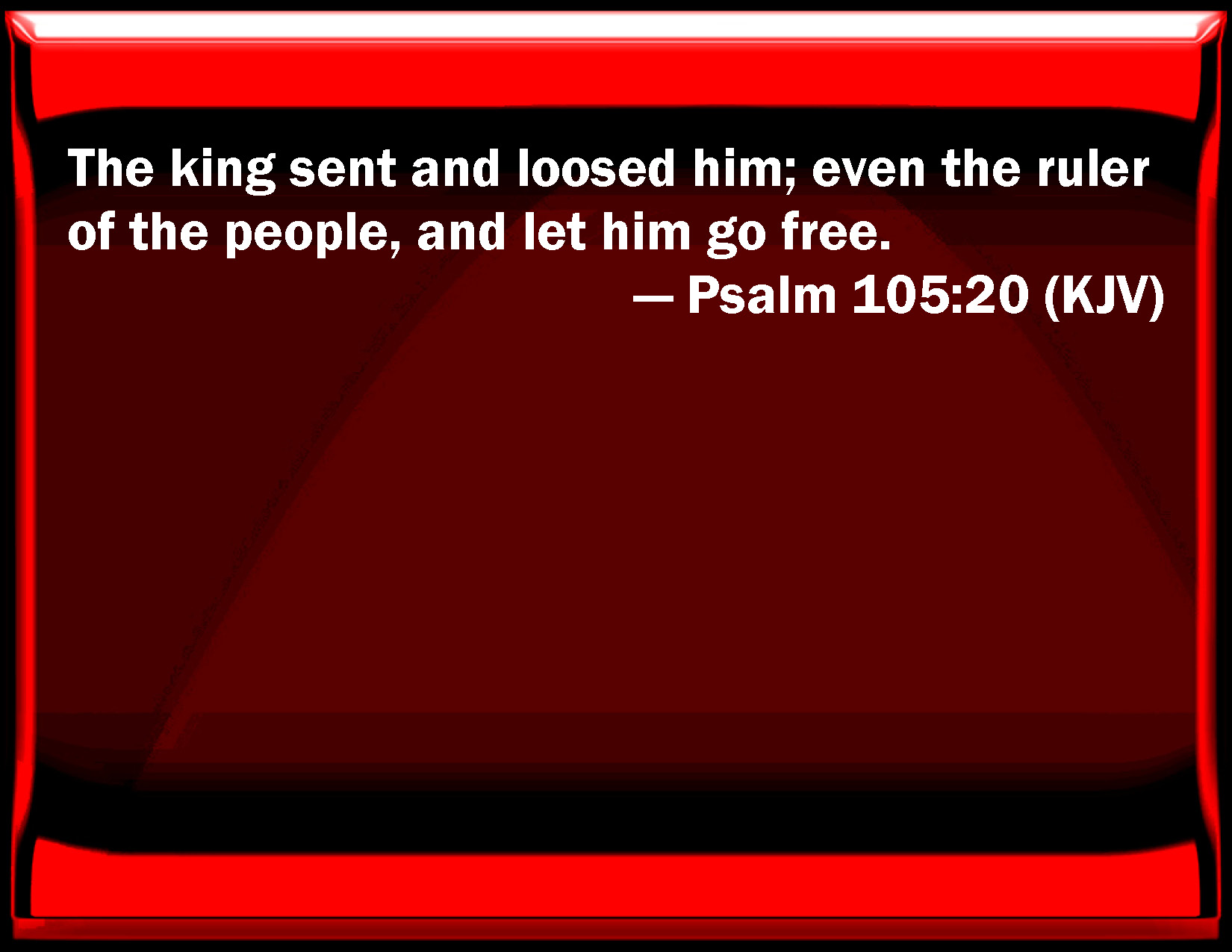 Bible Verse Slide Psalm 105:20 The king sent and loosed him; even the ruler of the people, and let him go free. KJV: The king sent and loosed him; even the ruler of the people, and let him go free. DRB: The king sent, and he released him: the ruler of the people, and he set him at liberty. DBT: The king sent and loosed him the ruler of peoples and let him go free. ERV: The king sent and loosed him; even the ruler of peoples, and let him go free. WBT: The king sent and loosed him; even the ruler of the people, and let him go free. WEB: The king sent and freed him; even the ruler of peoples, and let him go free. YLT: The king hath sent, and looseth him, The ruler of the peoples, and draweth him out.Links Psalm 105:20 NIV • Psalm 105:20 NLT • Psalm 105:20 ESV • Psalm 105:20 NASB • Psalm 105:20 KJV • Psalm 105:20 Interlinear • Psalm 105:20 Commentaries • Psalm 105:20 Parallel Texts • Psalm 105:20 Bible Apps • Psalm 105:20 Parallel • Bible Hub |
