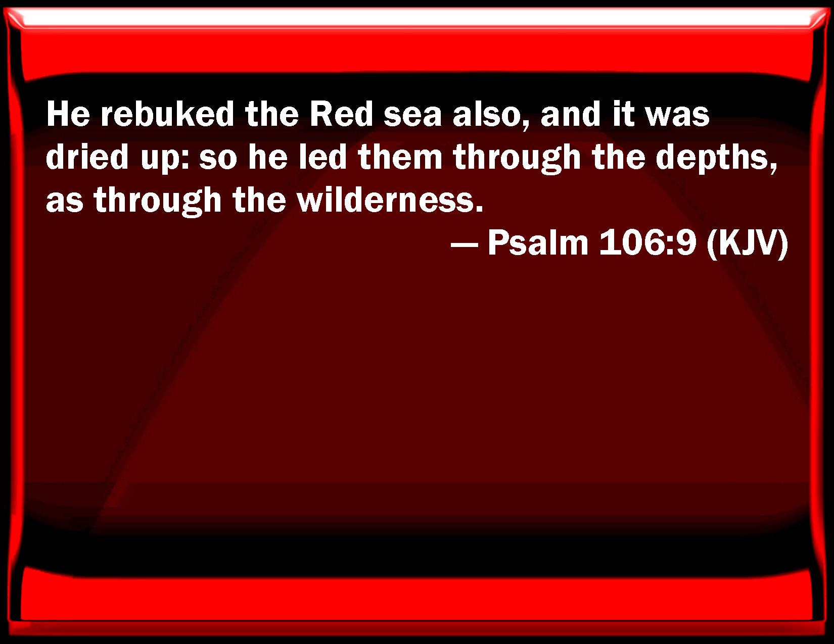 Bible Verse Slide Psalm 106:9 He rebuked the Red sea also, and it was dried up: so he led them through the depths, as through the wilderness. KJV: He rebuked the Red sea also, and it was dried up: so he led them through the depths, as through the wilderness. DRB: And he rebuked the Red Sea, and it was dried up: and he led them through the depths, as in a wilderness. DBT: And he rebuked the Red Sea, and it dried up; and he led them through the deeps as through a wilderness. ERV: He rebuked the Red Sea also, and it was dried up: so he led them through the depths, as through a wilderness. WBT: He rebuked the Red sea also, and it was dried up: so he led them through the depths, as through the wilderness. WEB: He rebuked the Red Sea also, and it was dried up; so he led them through the depths, as through a desert. YLT: And rebuketh the sea of Suph, and it is dried up, And causeth them to go Through depths as a wilderness.Links Psalm 106:9 NIV • Psalm 106:9 NLT • Psalm 106:9 ESV • Psalm 106:9 NASB • Psalm 106:9 KJV • Psalm 106:9 Interlinear • Psalm 106:9 Commentaries • Psalm 106:9 Parallel Texts • Psalm 106:9 Bible Apps • Psalm 106:9 Parallel • Bible Hub |
