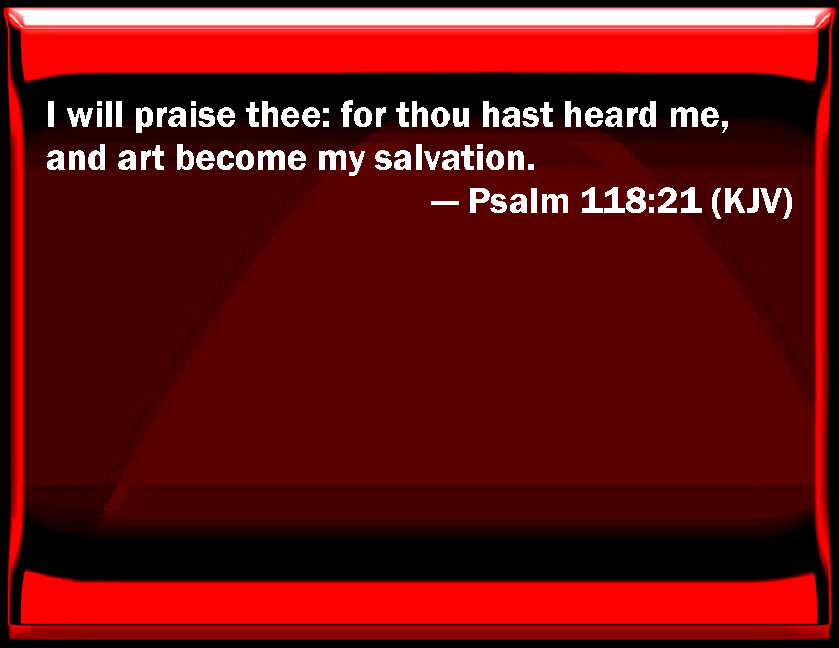 Bible Verse Slide Psalm 118:21 I will praise you: for you have heard me, and are become my salvation. KJV: I will praise thee: for thou hast heard me, and art become my salvation. DRB: I will give glory to thee because thou hast heard me: and art become my salvation. DBT: I will give thee thanks, for thou hast answered me, and art become my salvation. ERV: I will give thanks unto thee, for thou hast answered me, and art become my salvation. WBT: I will praise thee: for thou hast heard me, and art become my salvation. WEB: I will give thanks to you, for you have answered me, and have become my salvation. YLT: I thank Thee, for Thou hast answered me, And art to me for salvation.Links Psalm 118:21 NIV • Psalm 118:21 NLT • Psalm 118:21 ESV • Psalm 118:21 NASB • Psalm 118:21 KJV • Psalm 118:21 Interlinear • Psalm 118:21 Commentaries • Psalm 118:21 Parallel Texts • Psalm 118:21 Bible Apps • Psalm 118:21 Parallel • Bible Hub |