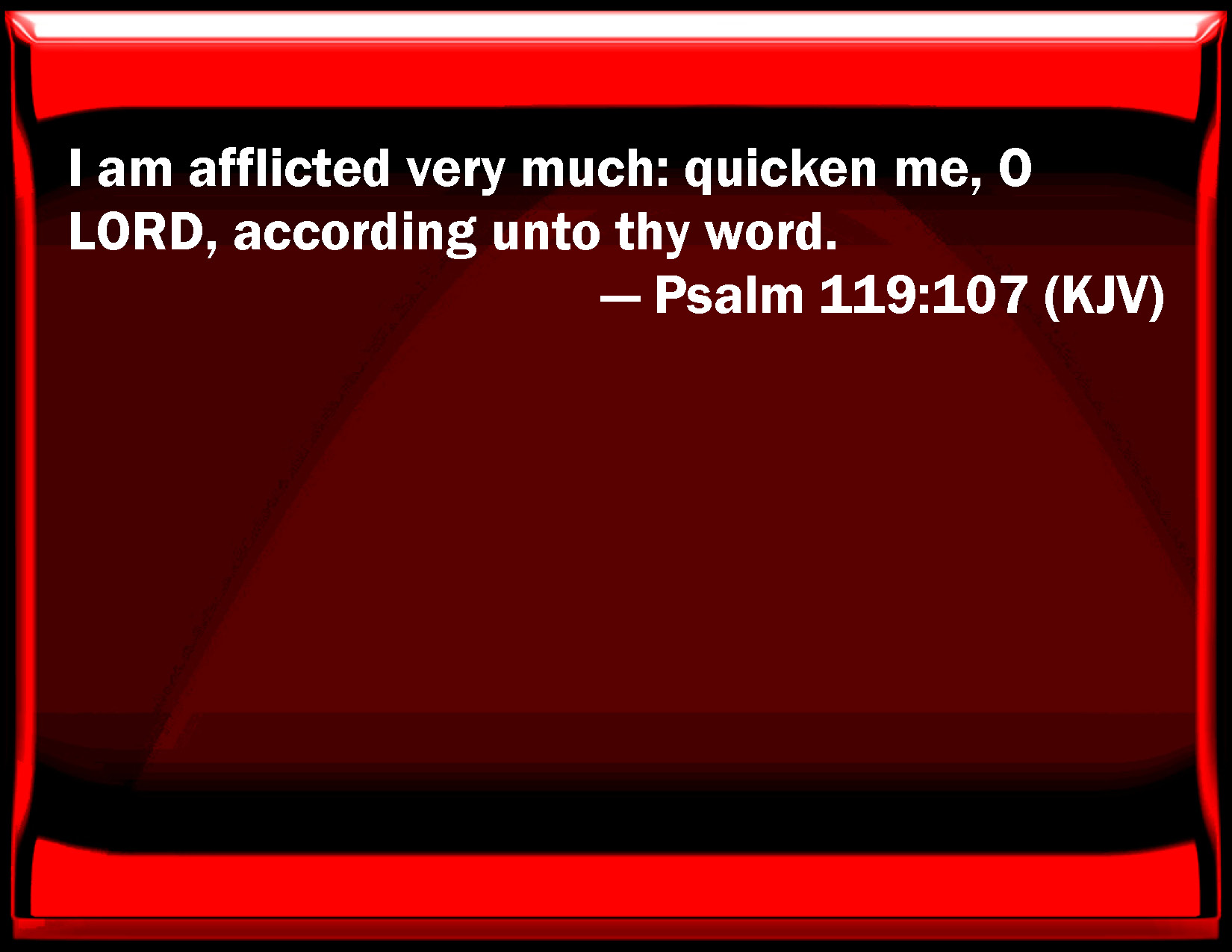 Bible Verse Slide Psalm 119:107 I am afflicted very much: quicken me, O LORD, according to your word. KJV: I am afflicted very much: quicken me, O LORD, according unto thy word. DRB: I have been humbled, O Lord, exceedingly: quicken thou me according to thy word. DBT: I am afflicted very much; O Jehovah, quicken me according to thy word. ERV: I am afflicted very much: quicken me, O LORD, according unto thy word. WBT: I am afflicted very much: revive me, O LORD, according to thy word. WEB: I am afflicted very much. Revive me, Yahweh, according to your word. YLT: I have been afflicted very much, O Jehovah, quicken me, according to Thy word.Links Psalm 119:107 NIV • Psalm 119:107 NLT • Psalm 119:107 ESV • Psalm 119:107 NASB • Psalm 119:107 KJV • Psalm 119:107 Interlinear • Psalm 119:107 Commentaries • Psalm 119:107 Parallel Texts • Psalm 119:107 Bible Apps • Psalm 119:107 Parallel • Bible Hub |