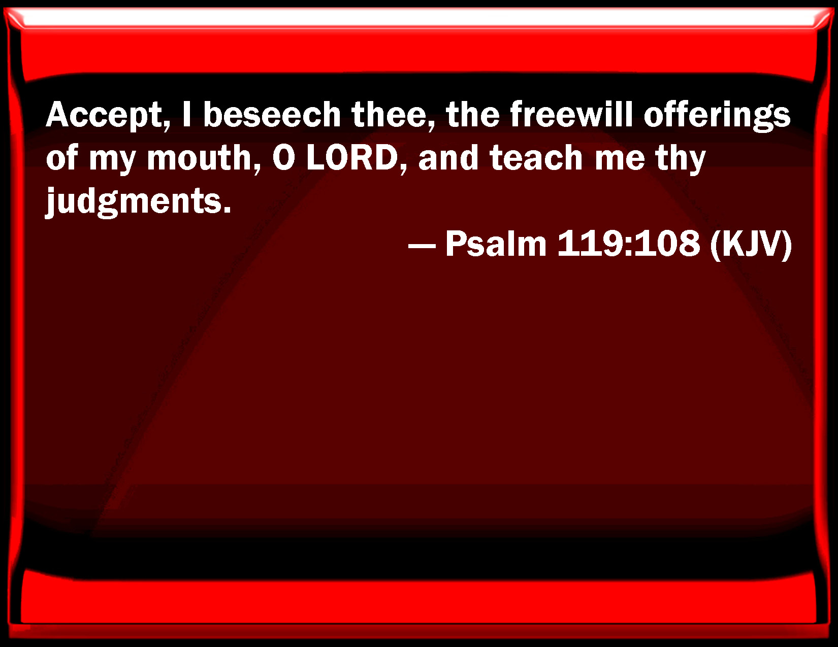 Bible Verse Slide Psalm 119:108 Accept, I beseech you, the freewill offerings of my mouth, O LORD, and teach me your judgments. KJV: Accept, I beseech thee, the freewill offerings of my mouth, O LORD, and teach me thy judgments. DRB: The free offerings of my mouth make acceptable, O Lord: and teach me thy judgments. DBT: Accept, I beseech thee, Jehovah, the voluntary-offerings of my mouth, and teach me thy judgments. ERV: Accept, I beseech thee, the freewill offerings of my mouth, O LORD, and teach me thy judgments. WBT: Accept, I beseech thee, the free-will-offerings of my mouth, O LORD, and teach me thy judgments. WEB: Accept, I beg you, the willing offerings of my mouth. Yahweh, teach me your ordinances. YLT: Free-will-offerings of my mouth, Accept, I pray Thee, O Jehovah, And Thy judgments teach Thou me.Links Psalm 119:108 NIV • Psalm 119:108 NLT • Psalm 119:108 ESV • Psalm 119:108 NASB • Psalm 119:108 KJV • Psalm 119:108 Interlinear • Psalm 119:108 Commentaries • Psalm 119:108 Parallel Texts • Psalm 119:108 Bible Apps • Psalm 119:108 Parallel • Bible Hub |