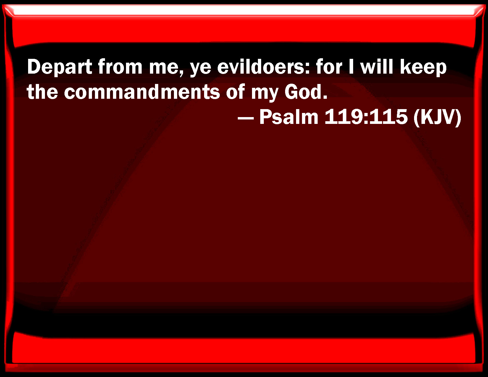 Bible Verse Slide Psalm 119:115 Depart from me, you evildoers: for I will keep the commandments of my God. KJV: Depart from me, ye evildoers: for I will keep the commandments of my God. DRB: Depart from me, ye malignant: and I will search the commandments of my God. DBT: Depart from me, ye evil-doers; and I will observe the commandments of my God. ERV: Depart from me, ye evil-doers; that I may keep the commandments of my God. WBT: Depart from me, ye evil-doers: for I will keep the commandments of my God. WEB: Depart from me, you evildoers, that I may keep the commandments of my God. YLT: Turn aside from me, ye evil-doers, And I keep the commands of my God.Links Psalm 119:115 NIV • Psalm 119:115 NLT • Psalm 119:115 ESV • Psalm 119:115 NASB • Psalm 119:115 KJV • Psalm 119:115 Interlinear • Psalm 119:115 Commentaries • Psalm 119:115 Parallel Texts • Psalm 119:115 Bible Apps • Psalm 119:115 Parallel • Bible Hub |