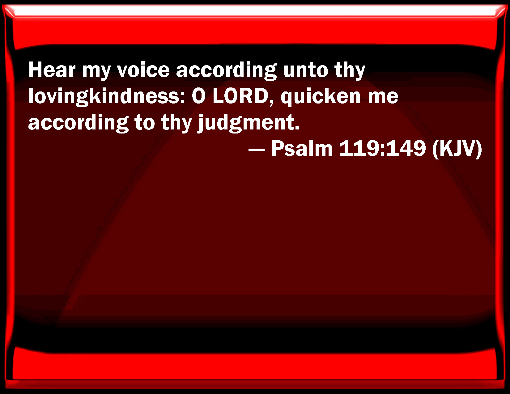 Bible Verse Slide Psalm 119:149 Hear my voice according to your loving kindness: O LORD, quicken me according to your judgment. KJV: Hear my voice according unto thy lovingkindness: O LORD, quicken me according to thy judgment. DRB: Hear thou my voice, O Lord, according to thy mercy: and quicken me according to thy mercy. DBT: Hear my voice according to thy loving-kindness: O Jehovah, quicken me according to thy judgment. ERV: Hear my voice according unto thy lovingkindness: quicken me, O LORD, according to thy judgments. WBT: Hear my voice, according to thy loving-kindness: O LORD, revive me according to thy judgment. WEB: Hear my voice according to your loving kindness. Revive me, Yahweh, according to your ordinances. YLT: My voice hear, according to Thy kindness, Jehovah, according to Thy judgment quicken me.Links Psalm 119:149 NIV • Psalm 119:149 NLT • Psalm 119:149 ESV • Psalm 119:149 NASB • Psalm 119:149 KJV • Psalm 119:149 Interlinear • Psalm 119:149 Commentaries • Psalm 119:149 Parallel Texts • Psalm 119:149 Bible Apps • Psalm 119:149 Parallel • Bible Hub |