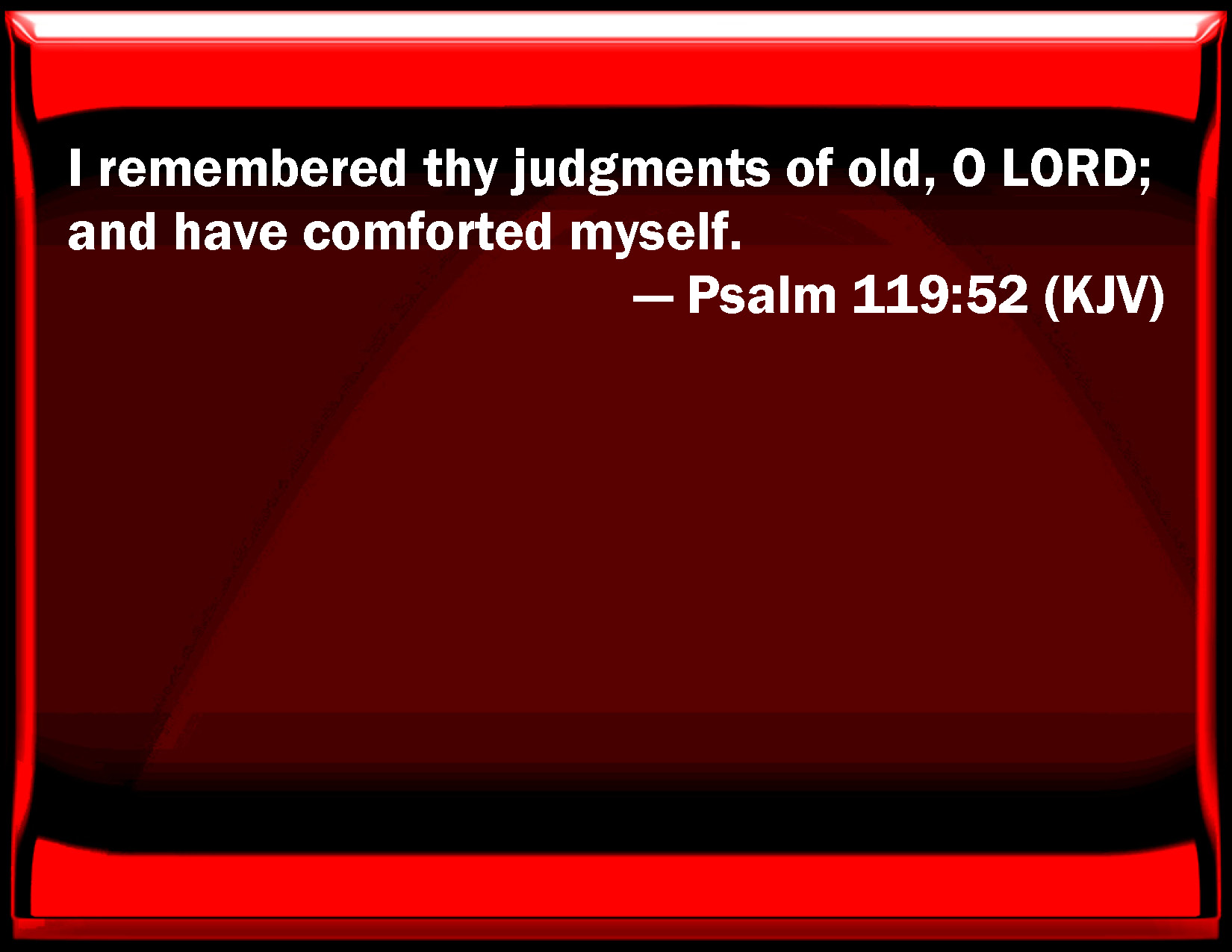 Bible Verse Slide Psalm 119:52 I remembered your judgments of old, O LORD; and have comforted myself. KJV: I remembered thy judgments of old, O LORD; and have comforted myself. DRB: I remembered, O Lord, thy judgments of old: and I was comforted. DBT: I remembered thy judgments of old, O Jehovah, and have comforted myself. ERV: I have remembered thy judgments of old, O LORD, and have comforted myself. WBT: I remembered thy judgments of old, O LORD; and have comforted myself. WEB: I remember your ordinances of old, Yahweh, and have comforted myself. YLT: I remembered Thy judgments of old, O Jehovah, And I comfort myself.Links Psalm 119:52 NIV • Psalm 119:52 NLT • Psalm 119:52 ESV • Psalm 119:52 NASB • Psalm 119:52 KJV • Psalm 119:52 Interlinear • Psalm 119:52 Commentaries • Psalm 119:52 Parallel Texts • Psalm 119:52 Bible Apps • Psalm 119:52 Parallel • Bible Hub |