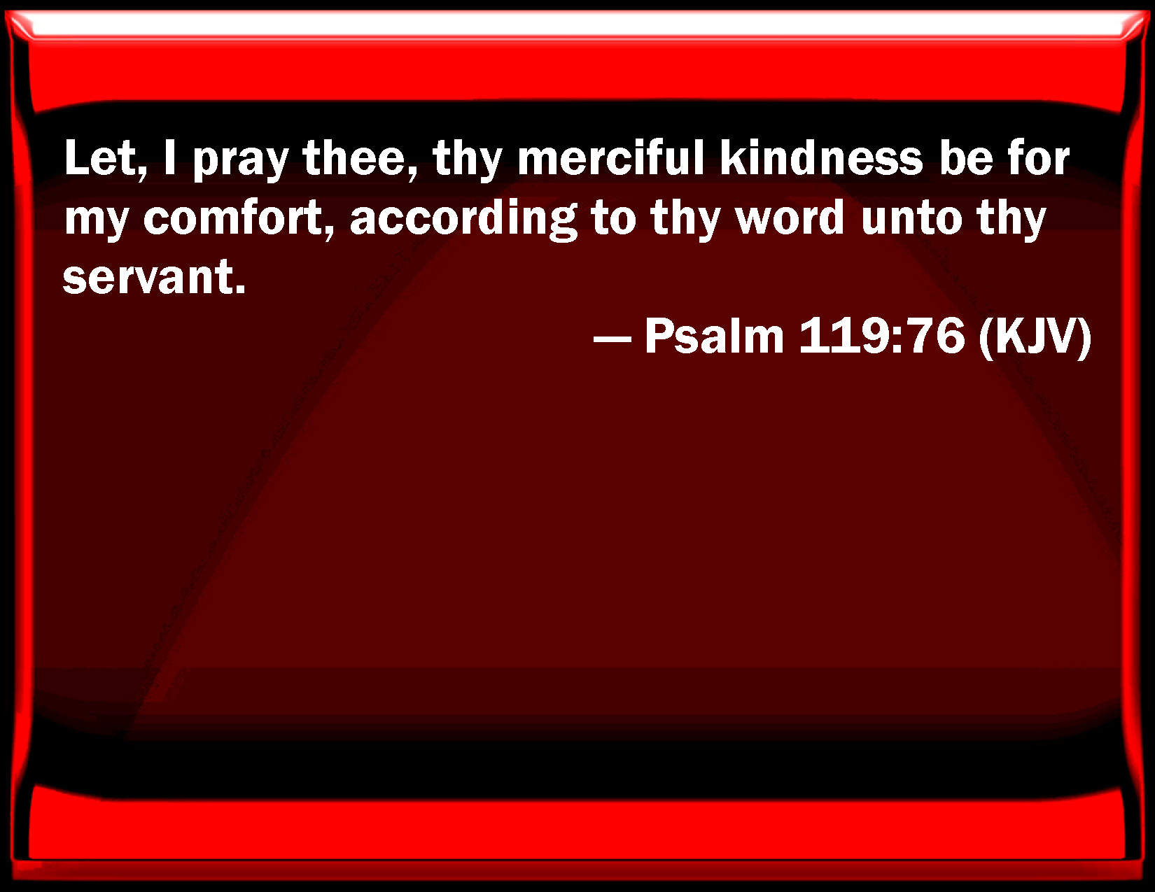 Bible Verse Slide Psalm 119:76 Let, I pray you, your merciful kindness be for my comfort, according to your word to your servant. KJV: Let, I pray thee, thy merciful kindness be for my comfort, according to thy word unto thy servant. DRB: O! let thy mercy be for my comfort, according to thy word unto thy servant. DBT: Oh let thy loving-kindness be for my comfort, according to thy word unto thy servant. ERV: Let, I pray thee, thy lovingkindness be for my comfort, according to thy word unto thy servant. WBT: Let, I pray thee, thy merciful kindness be for my comfort, according to thy word to thy servant. WEB: Please let your loving kindness be for my comfort, according to your word to your servant. YLT: Let, I pray Thee, Thy kindness be to comfort me, According to Thy saying to Thy servant.Links Psalm 119:76 NIV • Psalm 119:76 NLT • Psalm 119:76 ESV • Psalm 119:76 NASB • Psalm 119:76 KJV • Psalm 119:76 Interlinear • Psalm 119:76 Commentaries • Psalm 119:76 Parallel Texts • Psalm 119:76 Bible Apps • Psalm 119:76 Parallel • Bible Hub |