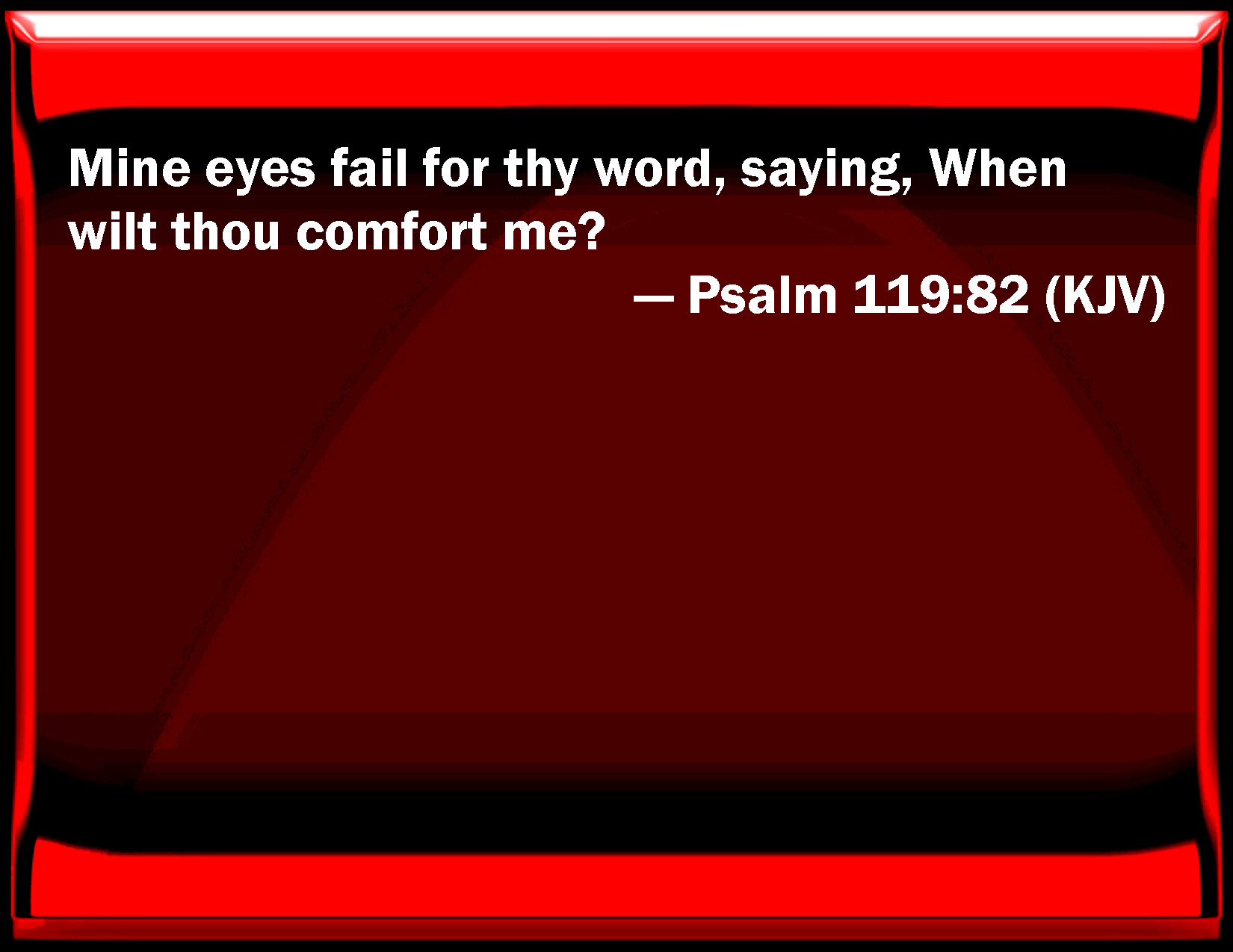 Bible Verse Slide Psalm 119:82 My eyes fail for your word, saying, When will you comfort me? KJV: Mine eyes fail for thy word, saying, When wilt thou comfort me? DRB: My eyes have failed for thy word, saying: When wilt thou comfort me? DBT: Mine eyes fail for thy word, saying, When wilt thou comfort me? ERV: Mine eyes fail for thy word, while I say, When wilt thou comfort me? WBT: My eyes fail for thy word, saying, When wilt thou comfort me? WEB: My eyes fail for your word. I say, "When will you comfort me?" YLT: Consumed have been mine eyes for Thy word, Saying, 'When doth it comfort me?'Links Psalm 119:82 NIV • Psalm 119:82 NLT • Psalm 119:82 ESV • Psalm 119:82 NASB • Psalm 119:82 KJV • Psalm 119:82 Interlinear • Psalm 119:82 Commentaries • Psalm 119:82 Parallel Texts • Psalm 119:82 Bible Apps • Psalm 119:82 Parallel • Bible Hub |