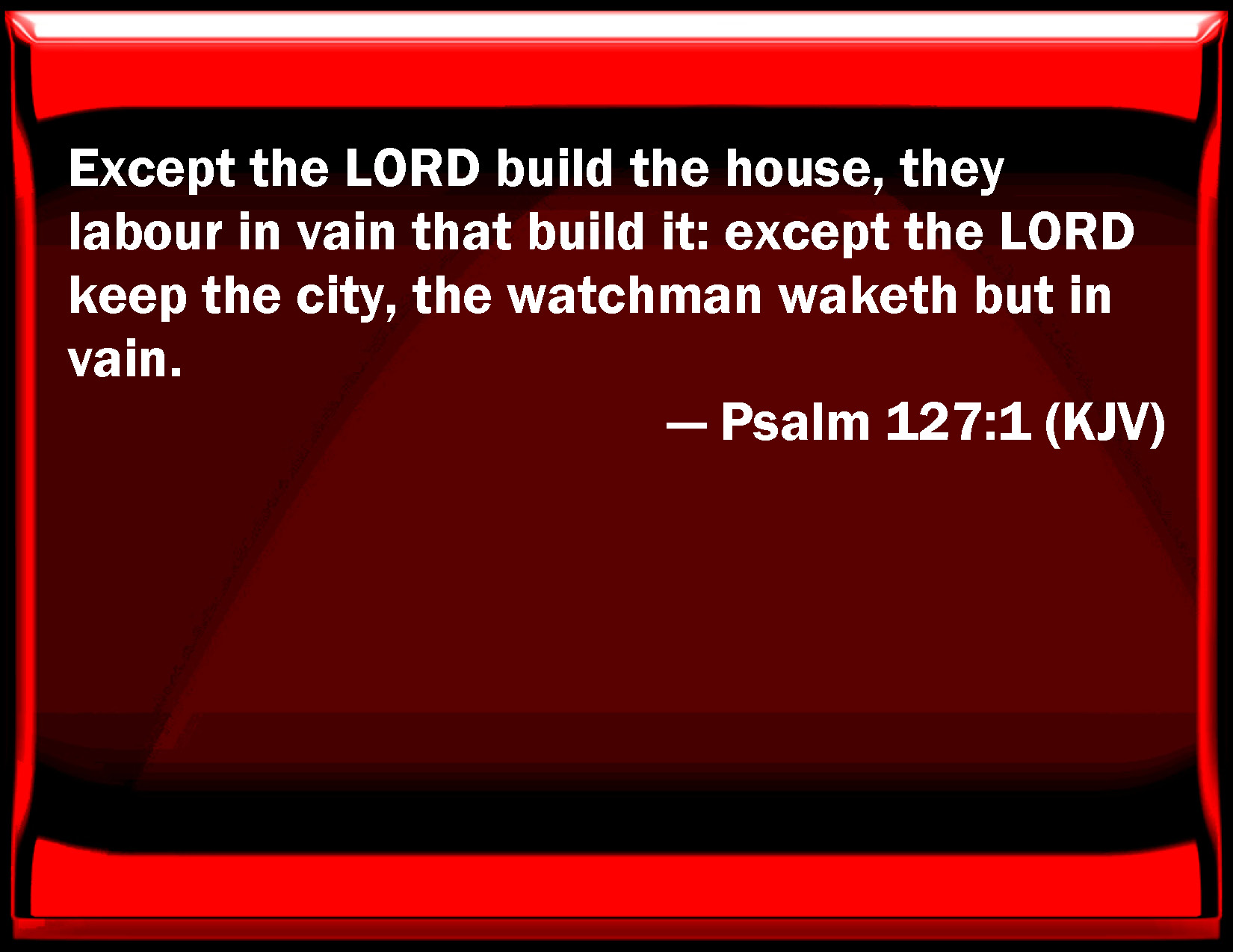 Bible Verse Slide Psalm 127:1 Except the LORD build the house, they labor in vain that build it: except the LORD keep the city, the watchman wakes but in vain. KJV: {A Song of degrees for Solomon.} Except the LORD build the house, they labour in vain that build it: except the LORD keep the city, the watchman waketh but in vain. DRB: Unless the Lord build the house, they labour in vain that build it. Unless the Lord keep the city, he watcheth in vain that keepeth it. DBT: {A Song of degrees. Of Solomon.} Unless Jehovah build the house, in vain do its builders labour in it; unless Jehovah keep the city, the keeper watcheth in vain: ERV: A Song of Ascents; of Solomon. Except the LORD build the house, they labour in vain that build it: except the LORD keep the city, the watchman waketh but in vain. WBT: A Song of degrees for Solomon. Except the LORD shall build the house, they labor in vain that build it: except the LORD shall keep the city, the watchman waketh in vain. WEB: Unless Yahweh builds the house, they labor in vain who build it. Unless Yahweh watches over the city, the watchman guards it in vain. YLT: A Song of the Ascents, by Solomon. If Jehovah doth not build the house, In vain have its builders laboured at it, If Jehovah doth not watch a city, In vain hath a watchman waked.Links Psalm 127:1 NIV • Psalm 127:1 NLT • Psalm 127:1 ESV • Psalm 127:1 NASB • Psalm 127:1 KJV • Psalm 127:1 Interlinear • Psalm 127:1 Commentaries • Psalm 127:1 Parallel Texts • Psalm 127:1 Bible Apps • Psalm 127:1 Parallel • Bible Hub |