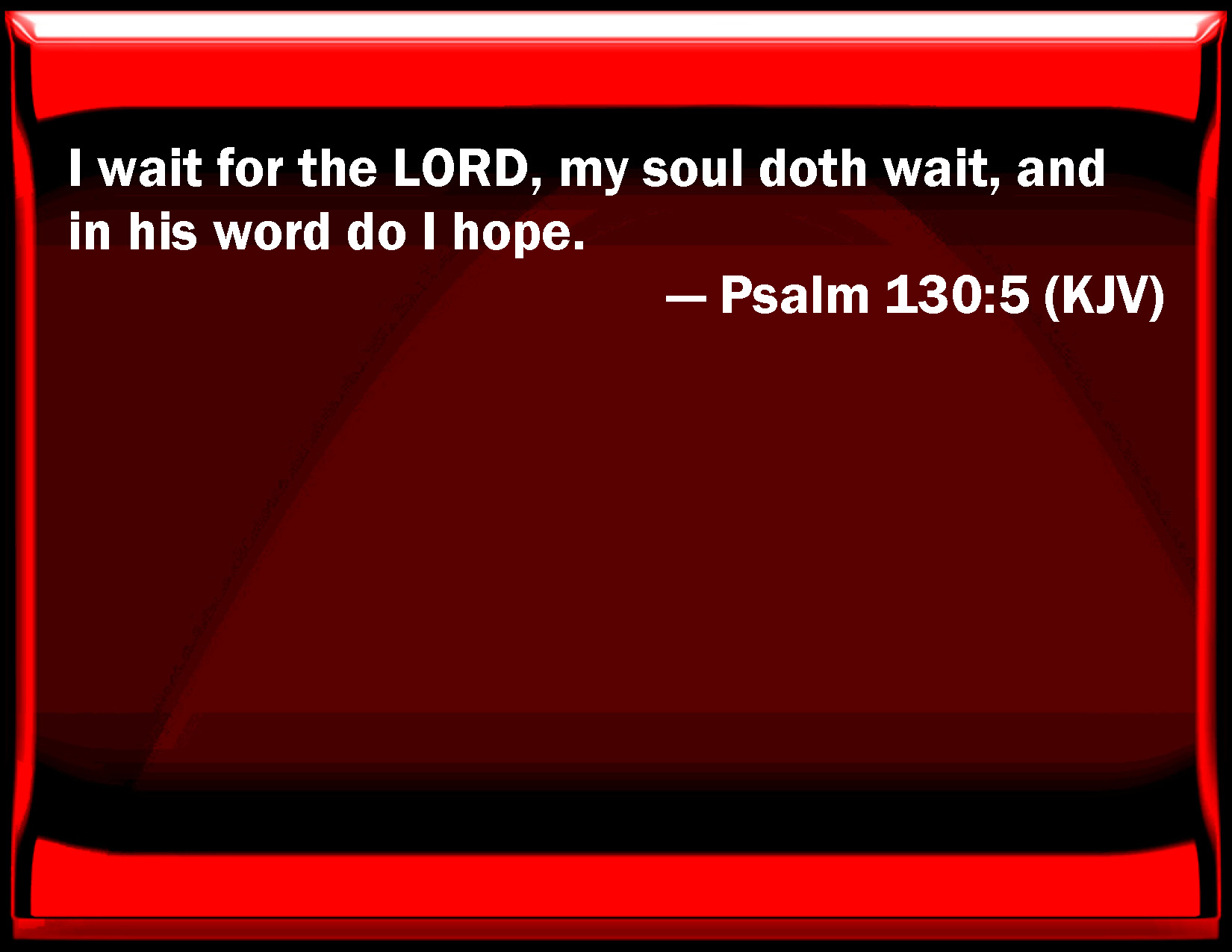 Bible Verse Slide Psalm 130:5 I wait for the LORD, my soul does wait, and in his word do I hope. KJV: I wait for the LORD, my soul doth wait, and in his word do I hope. DRB: my soul hath hoped in the Lord. DBT: I wait for Jehovah; my soul doth wait, and in his word do I hope. ERV: I wait for the LORD, my soul doth wait, and in his word do I hope. WBT: I wait for the LORD, my soul doth wait, and in his word do I hope. WEB: I wait for Yahweh. My soul waits. I hope in his word. YLT: I hoped for Jehovah — hoped hath my soul, And for His word I have waited.Links Psalm 130:5 NIV • Psalm 130:5 NLT • Psalm 130:5 ESV • Psalm 130:5 NASB • Psalm 130:5 KJV • Psalm 130:5 Interlinear • Psalm 130:5 Commentaries • Psalm 130:5 Parallel Texts • Psalm 130:5 Bible Apps • Psalm 130:5 Parallel • Bible Hub |