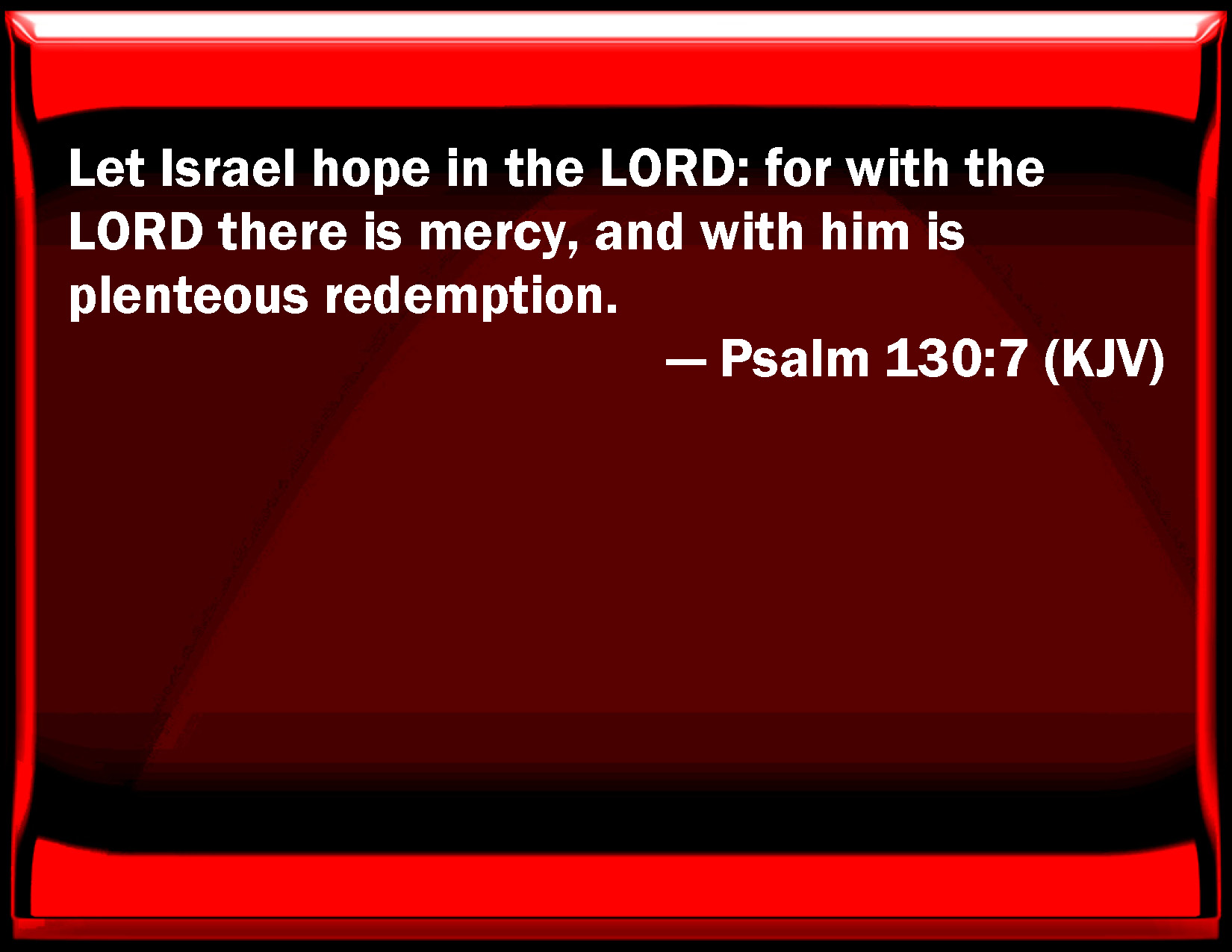Bible Verse Slide Psalm 130:7 Let Israel hope in the LORD: for with the LORD there is mercy, and with him is plenteous redemption. KJV: Let Israel hope in the LORD: for with the LORD there is mercy, and with him is plenteous redemption. DRB: Because with the Lord there is mercy: and with him plentiful redemption. DBT: Let Israel hope in Jehovah, because with Jehovah there is loving-kindness, and with him is plenteous redemption; ERV: O Israel, hope in the LORD; for with the LORD there is mercy, and with him is plenteous redemption. WBT: Let Israel hope in the LORD: for with the LORD there is mercy, and with him is plenteous redemption. WEB: Israel, hope in Yahweh, for with Yahweh there is loving kindness. With him is abundant redemption. YLT: Israel doth wait on Jehovah, For with Jehovah is kindness, And abundant with Him is redemption.Links Psalm 130:7 NIV • Psalm 130:7 NLT • Psalm 130:7 ESV • Psalm 130:7 NASB • Psalm 130:7 KJV • Psalm 130:7 Interlinear • Psalm 130:7 Commentaries • Psalm 130:7 Parallel Texts • Psalm 130:7 Bible Apps • Psalm 130:7 Parallel • Bible Hub |