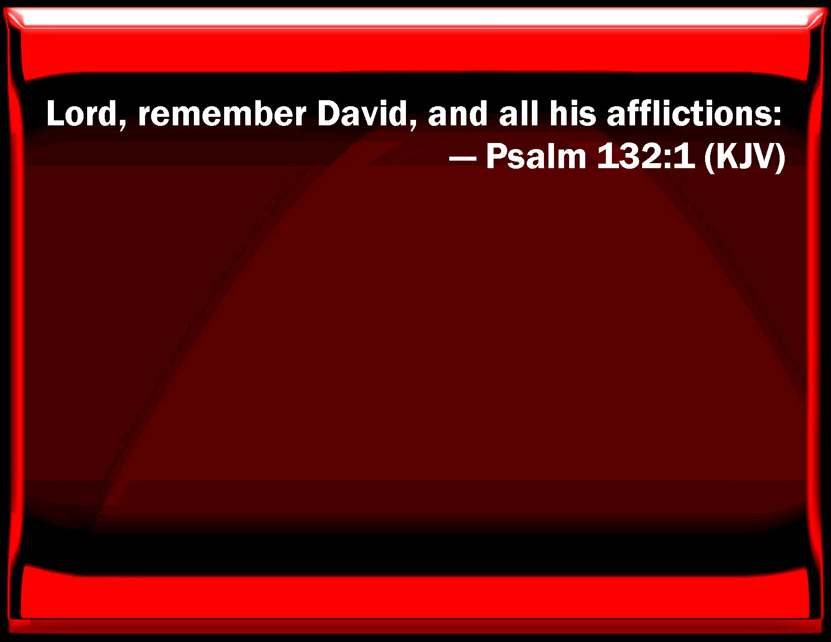 Bible Verse Slide Psalm 132:1 Lord, remember David, and all his afflictions: KJV: A Song of degrees. LORD, remember David, and all his afflictions: DRB: O Lord, remember David, and all his meekness. DBT: {A Song of degrees.} Jehovah, remember for David all his affliction; ERV: A Song of Ascents. LORD, remember for David all his affliction; WBT: A Song of degrees. LORD, remember David and all his afflictions; WEB: Yahweh, remember David and all his affliction, YLT: A Song of the Ascents. Remember, Jehovah, for David, all his afflictions.Links Psalm 132:1 NIV • Psalm 132:1 NLT • Psalm 132:1 ESV • Psalm 132:1 NASB • Psalm 132:1 KJV • Psalm 132:1 Interlinear • Psalm 132:1 Commentaries • Psalm 132:1 Parallel Texts • Psalm 132:1 Bible Apps • Psalm 132:1 Parallel • Bible Hub |
