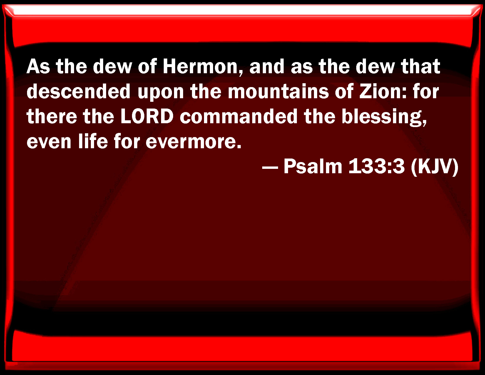 Bible Verse Slide Psalm 133:3 As the dew of Hermon, and as the dew that descended on the mountains of Zion: for there the LORD commanded the blessing, even life for ever more. KJV: As the dew of Hermon, and as the dew that descended upon the mountains of Zion: for there the LORD commanded the blessing, even life for evermore. DRB: as the dew of Hermon, which descendeth upon mount Sion. For there the Lord hath commandeth blessing, and life for evermore. DBT: As the dew of Hermon that descendeth on the mountains of Zion; for there hath Jehovah commanded the blessing, life for evermore. ERV: Like the dew of Hermon, that cometh down upon the mountains of Zion: for there the LORD commanded the blessing, even life for evermore. WBT: As the dew of Hermon, and as the dew that descended upon the mountains of Zion: for there the LORD commanded the blessing, even life for ever. WEB: like the dew of Hermon, that comes down on the hills of Zion: for there Yahweh gives the blessing, even life forevermore. A Song of Ascents. YLT: As dew of Hermon — That cometh down on hills of Zion, For there Jehovah commanded the blessing — Life unto the age!Links Psalm 133:3 NIV • Psalm 133:3 NLT • Psalm 133:3 ESV • Psalm 133:3 NASB • Psalm 133:3 KJV • Psalm 133:3 Interlinear • Psalm 133:3 Commentaries • Psalm 133:3 Parallel Texts • Psalm 133:3 Bible Apps • Psalm 133:3 Parallel • Bible Hub |
