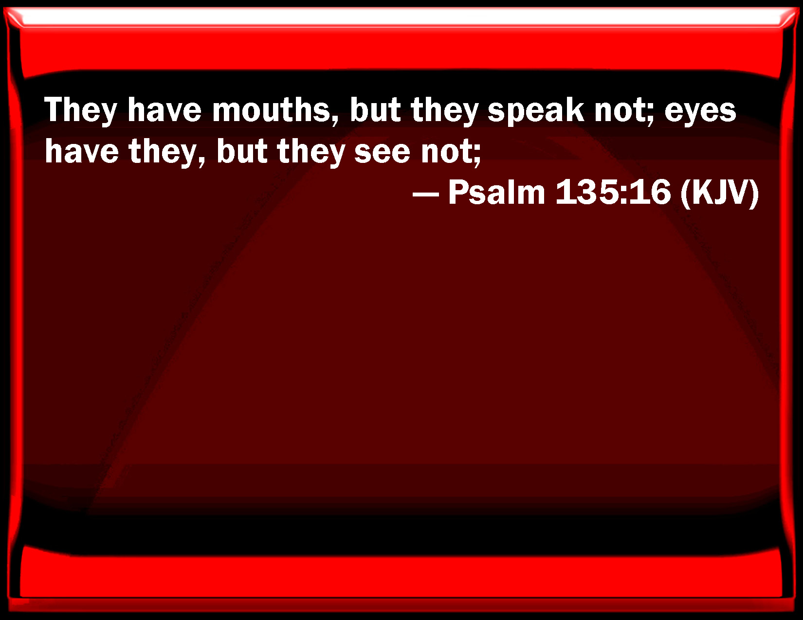 Bible Verse Slide Psalm 135:16 They have mouths, but they speak not; eyes have they, but they see not; KJV: They have mouths, but they speak not; eyes have they, but they see not; DRB: They have a mouth, but they speak not: they have eyes, but they see not. DBT: They have a mouth, and they speak not; eyes have they, and they see not; ERV: They have mouths, but they speak not; eyes have they, but they see not; WBT: They have mouths, but they speak not; eyes have they, but they see not. WEB: They have mouths, but they can't speak. They have eyes, but they can't see. YLT: A mouth they have, and they speak not, Eyes they have, and they see not,Links Psalm 135:16 NIV • Psalm 135:16 NLT • Psalm 135:16 ESV • Psalm 135:16 NASB • Psalm 135:16 KJV • Psalm 135:16 Interlinear • Psalm 135:16 Commentaries • Psalm 135:16 Parallel Texts • Psalm 135:16 Bible Apps • Psalm 135:16 Parallel • Bible Hub |