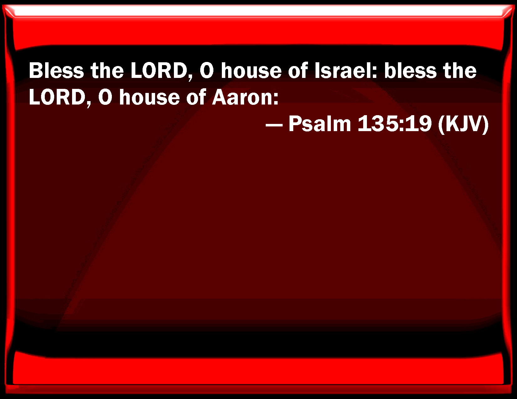 Bible Verse Slide Psalm 135:19 Bless the LORD, O house of Israel: bless the LORD, O house of Aaron: KJV: Bless the LORD, O house of Israel: bless the LORD, O house of Aaron: DRB: Bless the Lord, O house of Israel: bless the Lord, O house of Aaron. DBT: House of Israel, bless ye Jehovah; house of Aaron, bless ye Jehovah; ERV: O house of Israel, bless ye the LORD: O house of Aaron, bless ye the LORD: WBT: Bless the LORD, O house of Israel: bless the LORD, O house of Aaron: WEB: House of Israel, praise Yahweh! House of Aaron, praise Yahweh! YLT: O house of Israel, bless ye Jehovah, O house of Aaron, bless ye Jehovah,Links Psalm 135:19 NIV • Psalm 135:19 NLT • Psalm 135:19 ESV • Psalm 135:19 NASB • Psalm 135:19 KJV • Psalm 135:19 Interlinear • Psalm 135:19 Commentaries • Psalm 135:19 Parallel Texts • Psalm 135:19 Bible Apps • Psalm 135:19 Parallel • Bible Hub |