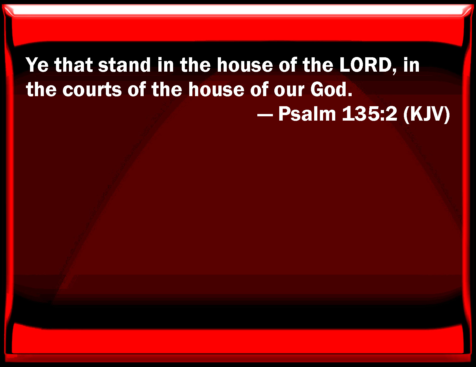 Bible Verse Slide Psalm 135:2 You that stand in the house of the LORD, in the courts of the house of our God. KJV: Ye that stand in the house of the LORD, in the courts of the house of our God, DRB: You that stand in the house of the Lord, in the courts of the house of our God. DBT: Ye that stand in the house of Jehovah, in the courts of the house of our God. ERV: Ye that stand in the house of the LORD, in the courts of the house of our God. WBT: Ye that stand in the house of the LORD, in the courts of the house of our God, WEB: you who stand in the house of Yahweh, in the courts of our God's house. YLT: Who are standing in the house of Jehovah, In the courts of the house of our God.Links Psalm 135:2 NIV • Psalm 135:2 NLT • Psalm 135:2 ESV • Psalm 135:2 NASB • Psalm 135:2 KJV • Psalm 135:2 Interlinear • Psalm 135:2 Commentaries • Psalm 135:2 Parallel Texts • Psalm 135:2 Bible Apps • Psalm 135:2 Parallel • Bible Hub |