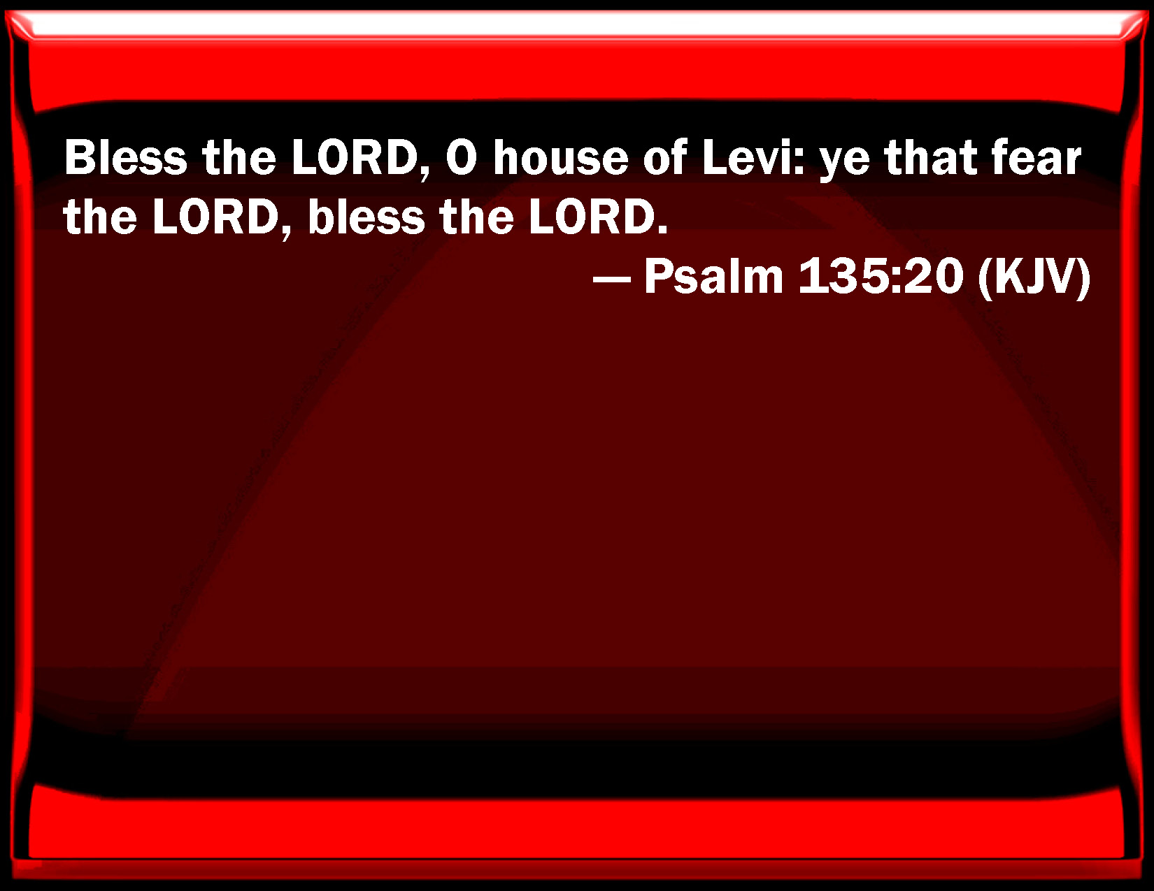 Bible Verse Slide Psalm 135:20 Bless the LORD, O house of Levi: you that fear the LORD, bless the LORD. KJV: Bless the LORD, O house of Levi: ye that fear the LORD, bless the LORD. DRB: Bless the Lord, O house of Levi: you that fear the Lord, bless the Lord. DBT: House of Levi, bless ye Jehovah; ye that fear Jehovah, bless Jehovah. ERV: O house of Levi, bless ye the LORD: ye that fear the LORD, bless ye the LORD. WBT: Bless the LORD, O house of Levi: ye that fear the LORD, bless the LORD. WEB: House of Levi, praise Yahweh! You who fear Yahweh, praise Yahweh! YLT: O house of Levi, bless ye Jehovah, Those fearing Jehovah, bless ye Jehovah.Links Psalm 135:20 NIV • Psalm 135:20 NLT • Psalm 135:20 ESV • Psalm 135:20 NASB • Psalm 135:20 KJV • Psalm 135:20 Interlinear • Psalm 135:20 Commentaries • Psalm 135:20 Parallel Texts • Psalm 135:20 Bible Apps • Psalm 135:20 Parallel • Bible Hub |