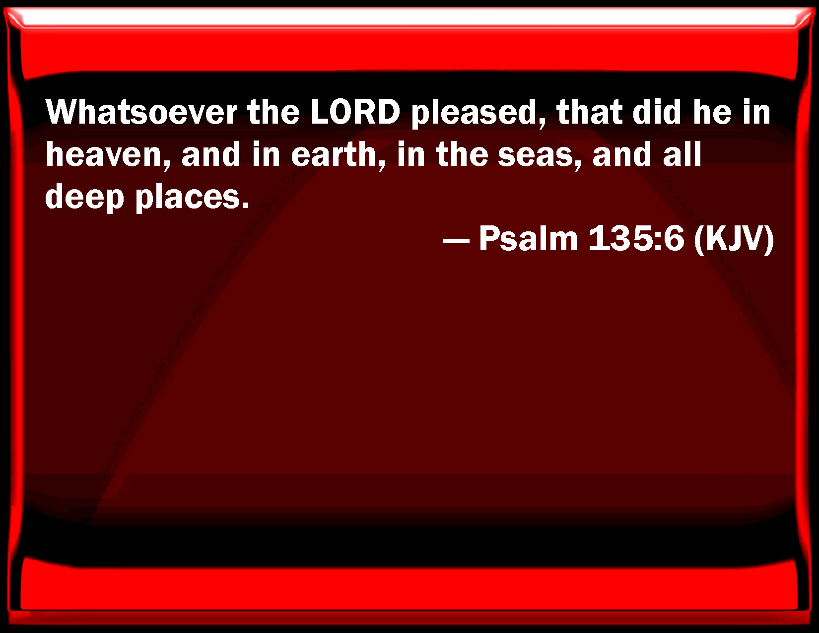 Bible Verse Slide Psalm 135:6 Whatever the LORD pleased, that did he in heaven, and in earth, in the seas, and all deep places. KJV: Whatsoever the LORD pleased, that did he in heaven, and in earth, in the seas, and all deep places. DRB: Whatsoever the Lord hath pleased he hath done, in heaven, in earth, in the sea, and in all the deeps. DBT: Whatsoever Jehovah pleased, he hath done in the heavens and on the earth, in the seas and all deeps; ERV: Whatsoever the LORD pleased, that hath he done, in heaven and in earth, in the seas and in all deeps. WBT: Whatever the LORD pleased, that did he in heaven, and in earth, in the seas, and all deep places. WEB: Whatever Yahweh pleased, that he has done, in heaven and in earth, in the seas and in all deeps; YLT: All that Jehovah pleased He hath done, In the heavens and in earth, In the seas and all deep places,Links Psalm 135:6 NIV • Psalm 135:6 NLT • Psalm 135:6 ESV • Psalm 135:6 NASB • Psalm 135:6 KJV • Psalm 135:6 Interlinear • Psalm 135:6 Commentaries • Psalm 135:6 Parallel Texts • Psalm 135:6 Bible Apps • Psalm 135:6 Parallel • Bible Hub |