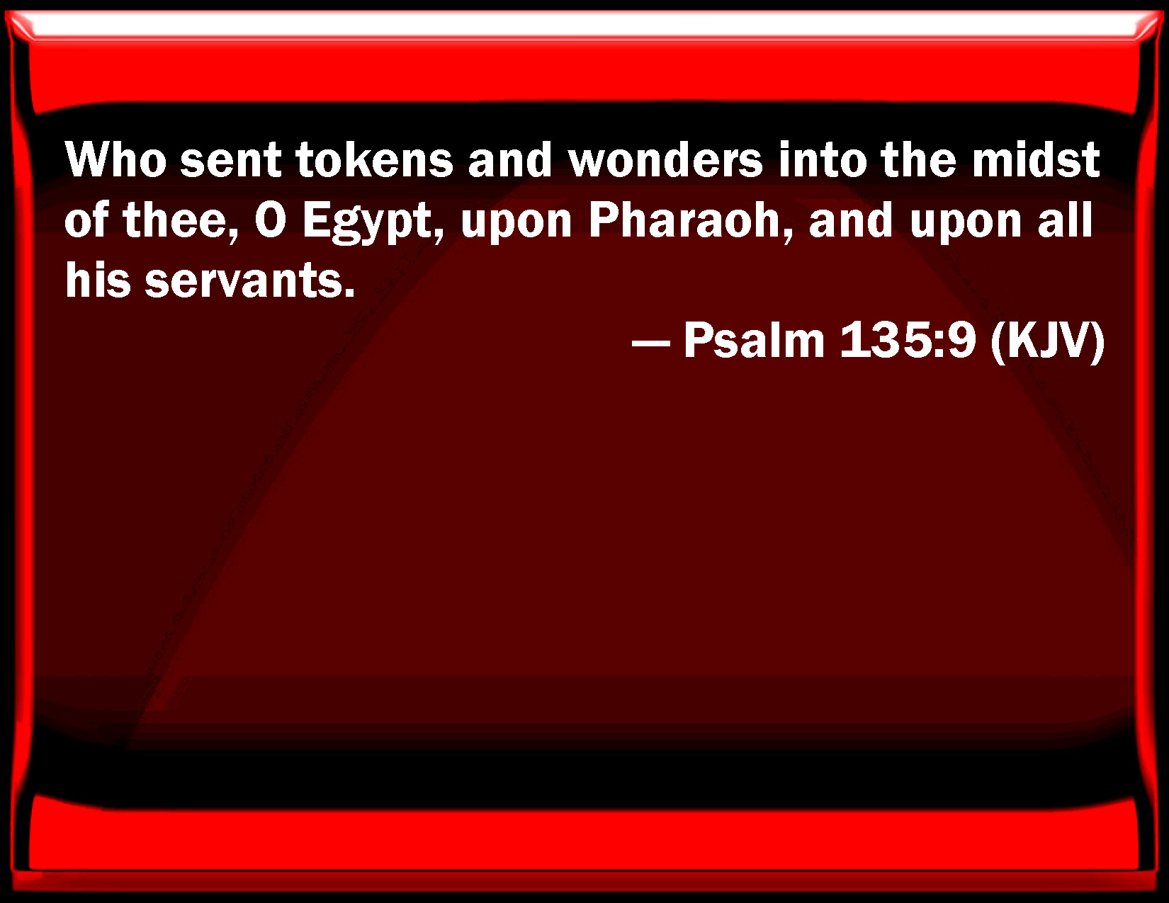 Bible Verse Slide Psalm 135:9 Who sent tokens and wonders into the middle of you, O Egypt, on Pharaoh, and on all his servants. KJV: Who sent tokens and wonders into the midst of thee, O Egypt, upon Pharaoh, and upon all his servants. DRB: He sent forth signs and wonders in the midst of thee, O Egypt: upon Pharao, and upon all his servants. DBT: Who sent signs and miracles into the midst of thee, O Egypt, upon Pharaoh and upon all his servants; ERV: He sent signs and wonders into the midst of thee, O Egypt, upon Pharaoh, and upon all his servants. WBT: Who sent tokens and wonders into the midst of thee, O Egypt, upon Pharaoh, and upon all his servants. WEB: Who sent signs and wonders into the midst of you, Egypt, on Pharaoh, and on all his servants; YLT: He sent tokens and wonders into thy midst, O Egypt, On Pharaoh and on all his servants.Links Psalm 135:9 NIV • Psalm 135:9 NLT • Psalm 135:9 ESV • Psalm 135:9 NASB • Psalm 135:9 KJV • Psalm 135:9 Interlinear • Psalm 135:9 Commentaries • Psalm 135:9 Parallel Texts • Psalm 135:9 Bible Apps • Psalm 135:9 Parallel • Bible Hub |