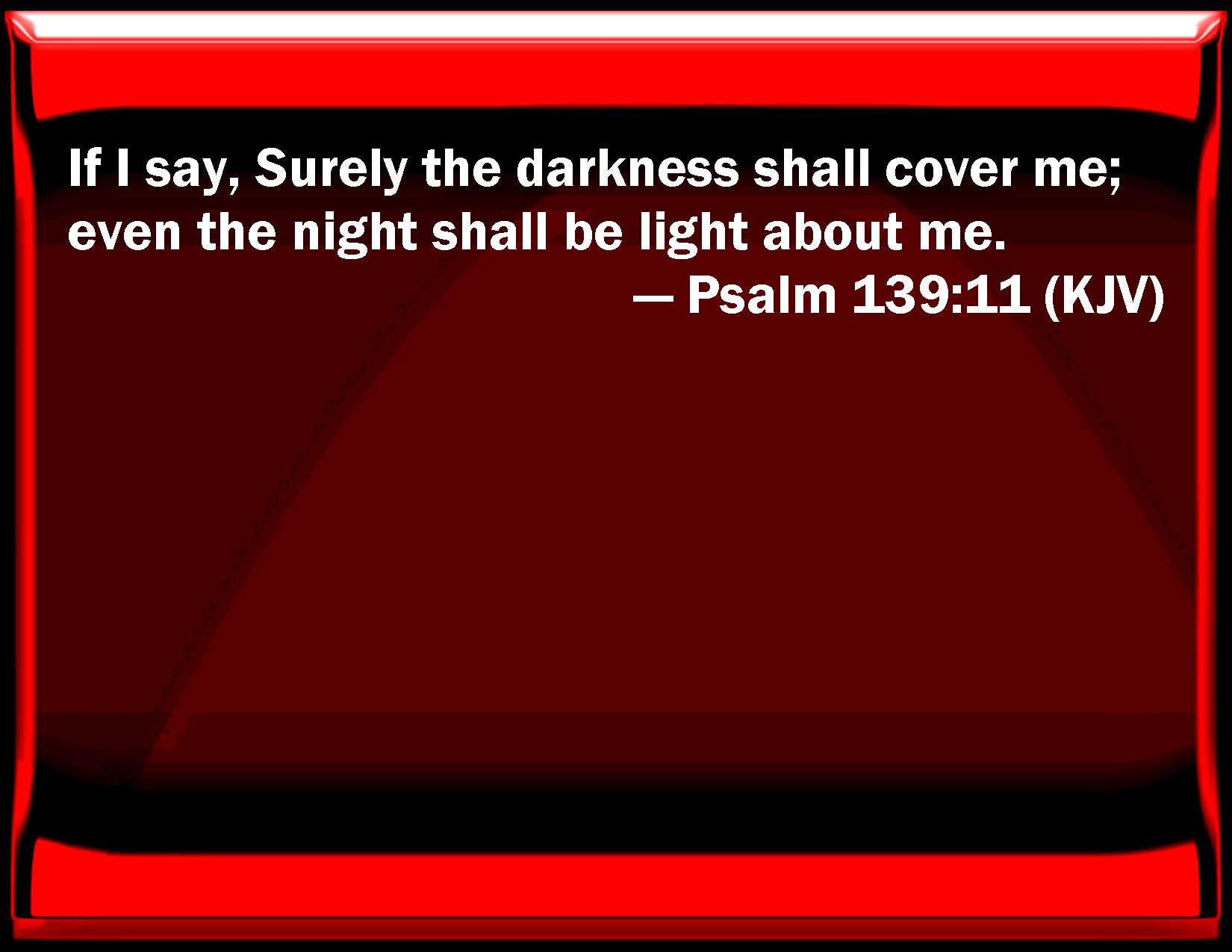 Bible Verse Slide Psalm 139:11 If I say, Surely the darkness shall cover me; even the night shall be light about me. KJV: If I say, Surely the darkness shall cover me; even the night shall be light about me. DRB: And I said: Perhaps darkness shall cover me: and night shall be my light in my pleasures. DBT: And if I say, Surely darkness shall cover me, and the light about me be night; ERV: If I say, Surely the darkness shall overwhelm me, and the light about me shall be night; WBT: If I say, Surely the darkness shall cover me; even the night shall be light about me. WEB: If I say, "Surely the darkness will overwhelm me; the light around me will be night;" YLT: And I say, 'Surely darkness bruiseth me, Then night is light to me.Links Psalm 139:11 NIV • Psalm 139:11 NLT • Psalm 139:11 ESV • Psalm 139:11 NASB • Psalm 139:11 KJV • Psalm 139:11 Interlinear • Psalm 139:11 Commentaries • Psalm 139:11 Parallel Texts • Psalm 139:11 Bible Apps • Psalm 139:11 Parallel • Bible Hub |