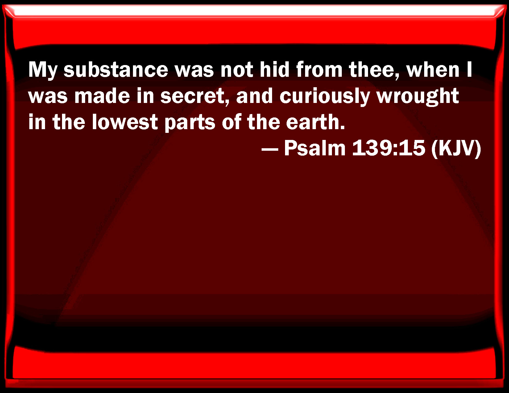 Bible Verse Slide Psalm 139:15 My substance was not hid from you, when I was made in secret, and curiously worked in the lowest parts of the earth. KJV: My substance was not hid from thee, when I was made in secret, and curiously wrought in the lowest parts of the earth. DRB: My bone is not hidden from thee, which thou hast made in secret: and my substance in the lower parts of the earth. DBT: My bones were not hidden from thee when I was made in secret, curiously wrought in the lower parts of the earth. ERV: My frame was not hidden from thee, when I was made in secret, and curiously wrought in the lowest parts of the earth. WBT: My substance was not hid from thee when I was made in secret, and curiously formed in the lowest parts of the earth. WEB: My frame wasn't hidden from you, when I was made in secret, woven together in the depths of the earth. YLT: My substance was not hid from Thee, When I was made in secret, Curiously wrought in the lower part of earth.Links Psalm 139:15 NIV • Psalm 139:15 NLT • Psalm 139:15 ESV • Psalm 139:15 NASB • Psalm 139:15 KJV • Psalm 139:15 Interlinear • Psalm 139:15 Commentaries • Psalm 139:15 Parallel Texts • Psalm 139:15 Bible Apps • Psalm 139:15 Parallel • Bible Hub |