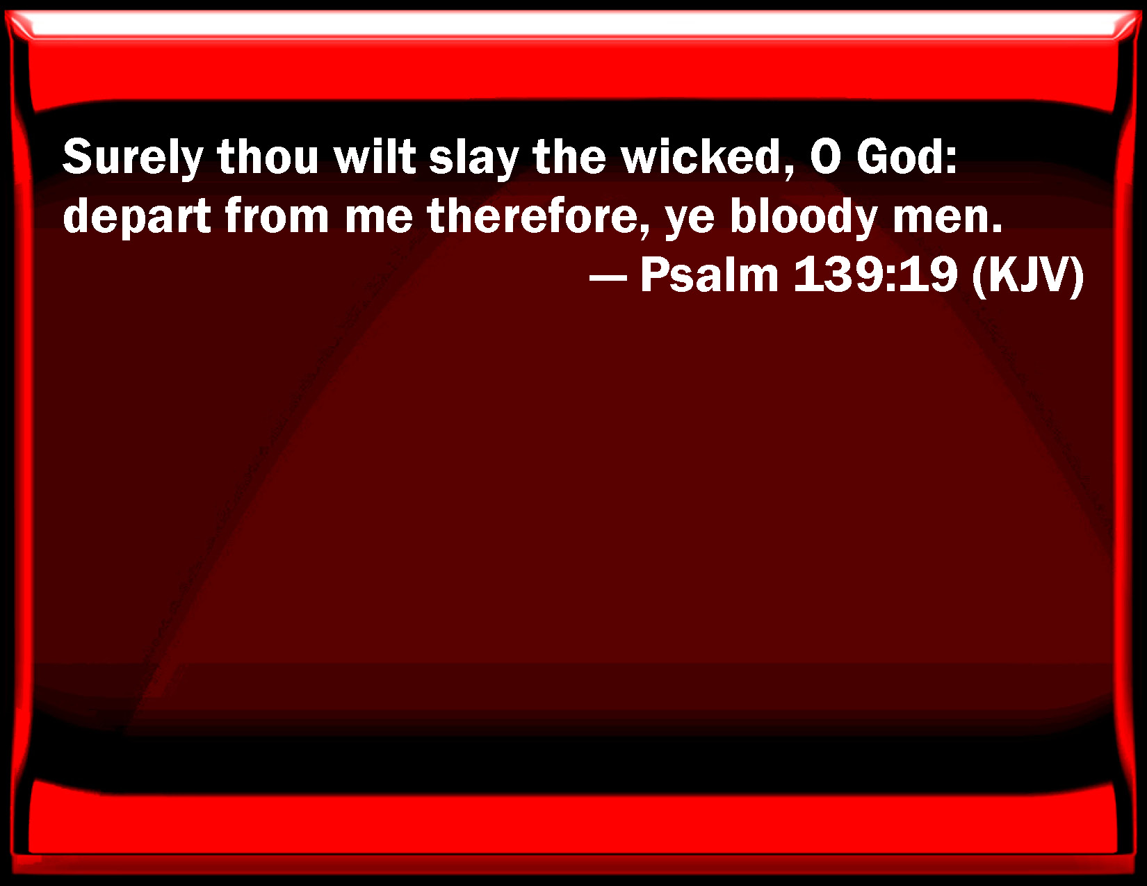Bible Verse Slide Psalm 139:19 Surely you will slay the wicked, O God: depart from me therefore, you bloody men. KJV: Surely thou wilt slay the wicked, O God: depart from me therefore, ye bloody men. DRB: If thou wilt kill the wicked, O God: ye men of blood, depart from me: DBT: Oh that thou wouldest slay the wicked, O +God! And ye men of blood, depart from me. ERV: Surely thou wilt slay the wicked, O God: depart from me therefore, ye bloodthirsty men. WBT: Surely thou wilt slay the wicked, O God: depart from me therefore, ye bloody men. WEB: If only you, God, would kill the wicked. Get away from me, you bloodthirsty men! YLT: Dost Thou slay, O God, the wicked? Then, men of blood, turn aside from me!Links Psalm 139:19 NIV • Psalm 139:19 NLT • Psalm 139:19 ESV • Psalm 139:19 NASB • Psalm 139:19 KJV • Psalm 139:19 Interlinear • Psalm 139:19 Commentaries • Psalm 139:19 Parallel Texts • Psalm 139:19 Bible Apps • Psalm 139:19 Parallel • Bible Hub |