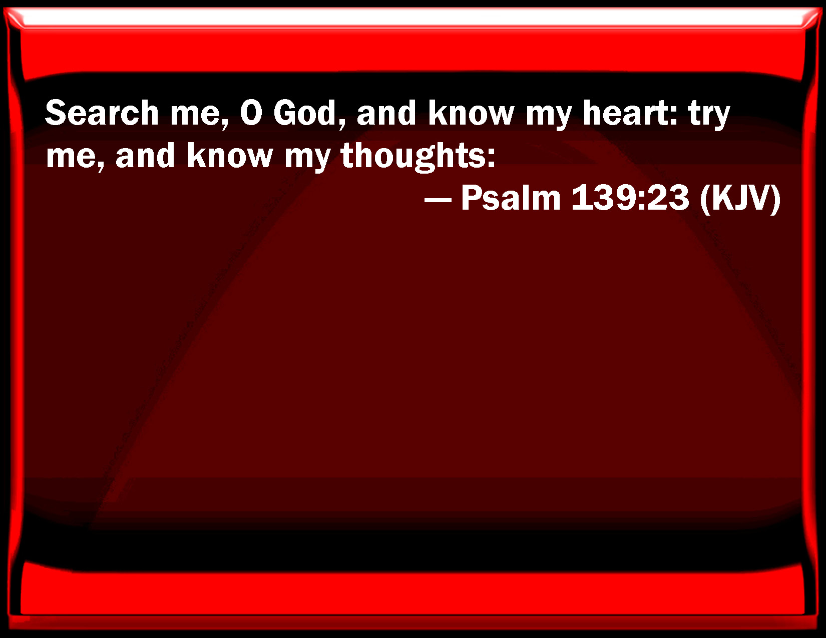 Bible Verse Slide Psalm 139:23 Search me, O God, and know my heart: try me, and know my thoughts: KJV: Search me, O God, and know my heart: try me, and know my thoughts: DRB: Prove me, O God, and know my heart: examine me, and know my paths. DBT: Search me, O God, and know my heart; prove me, and know my thoughts; ERV: Search me, O God, and know my heart: try me and know my thoughts: WBT: Search me, O God, and know my heart; try me, and know my thoughts: WEB: Search me, God, and know my heart. Try me, and know my thoughts. YLT: Search me, O God, and know my heart, Try me, and know my thoughts,Links Psalm 139:23 NIV • Psalm 139:23 NLT • Psalm 139:23 ESV • Psalm 139:23 NASB • Psalm 139:23 KJV • Psalm 139:23 Interlinear • Psalm 139:23 Commentaries • Psalm 139:23 Parallel Texts • Psalm 139:23 Bible Apps • Psalm 139:23 Parallel • Bible Hub |