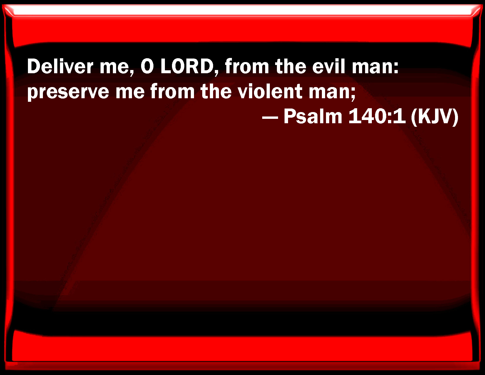 Bible Verse Slide Psalm 140:1 Deliver me, O LORD, from the evil man: preserve me from the violent man; KJV: {To the chief Musician, A Psalm of David.} Deliver me, O LORD, from the evil man: preserve me from the violent man; DRB: Unto the end, a psalm for David. Deliver me, O Lord, from the evil man: rescue me from the unjust man. DBT: {To the chief Musician. A Psalm of David.} Free me, O Jehovah, from the evil man; preserve me from the violent man: ERV: For the Chief Musician. A Psalm of David. Deliver me, O LORD, from the evil man; preserve me from the violent man: WBT: To the chief Musician, A Psalm of David. Deliver me, O LORD, from the evil man: preserve me from the violent man; WEB: Deliver me, Yahweh, from the evil man. Preserve me from the violent man; YLT: To the Overseer. — A Psalm of David. Deliver me, O Jehovah, from an evil man, From one of violence Thou keepest me.Links Psalm 140:1 NIV • Psalm 140:1 NLT • Psalm 140:1 ESV • Psalm 140:1 NASB • Psalm 140:1 KJV • Psalm 140:1 Interlinear • Psalm 140:1 Commentaries • Psalm 140:1 Parallel Texts • Psalm 140:1 Bible Apps • Psalm 140:1 Parallel • Bible Hub |