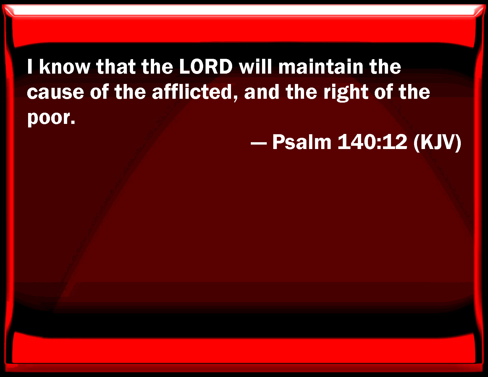 Psalm 140:12 I know that the LORD will maintain the cause of the afflicted, and the right of the poor.