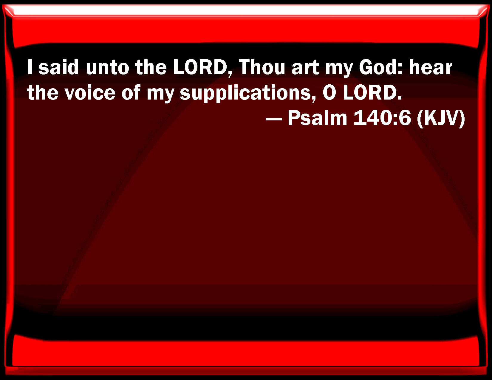 Bible Verse Slide Psalm 140:6 I said to the LORD, You are my God: hear the voice of my supplications, O LORD. KJV: I said unto the LORD, Thou art my God: hear the voice of my supplications, O LORD. DRB: I said to the Lord: Thou art my God: hear, O Lord, the voice of my supplication. DBT: I have said unto Jehovah, Thou art my God: give ear, O Jehovah, to the voice of my supplications. ERV: I said unto the LORD, Thou art my God: give ear unto the voice of my supplications, O LORD. WBT: I said to the LORD, Thou art my God: hear the voice of my supplications, O LORD. WEB: I said to Yahweh, "You are my God." Listen to the cry of my petitions, Yahweh. YLT: I have said to Jehovah, 'My God art Thou, Hear, Jehovah, the voice of my supplications.'Links Psalm 140:6 NIV • Psalm 140:6 NLT • Psalm 140:6 ESV • Psalm 140:6 NASB • Psalm 140:6 KJV • Psalm 140:6 Interlinear • Psalm 140:6 Commentaries • Psalm 140:6 Parallel Texts • Psalm 140:6 Bible Apps • Psalm 140:6 Parallel • Bible Hub |