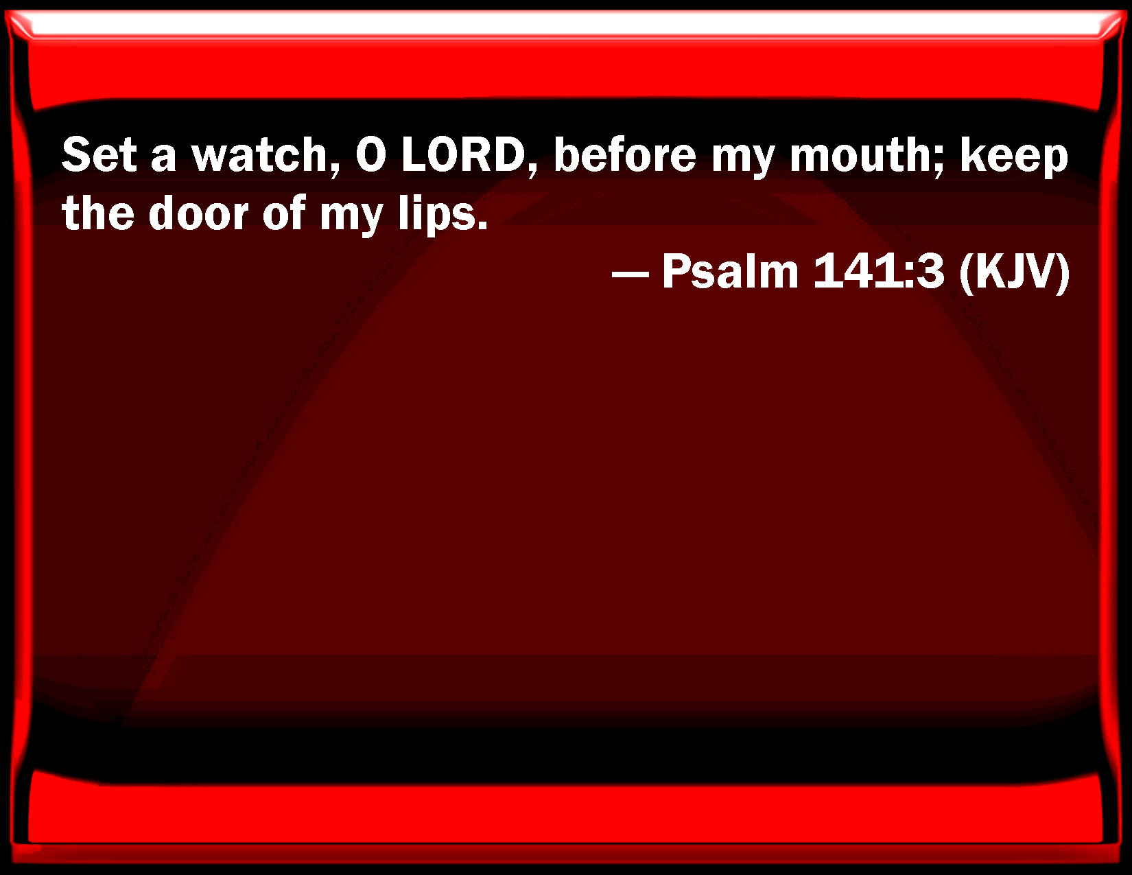 Bible Verse Slide Psalm 141:3 Set a watch, O LORD, before my mouth; keep the door of my lips. KJV: Set a watch, O LORD, before my mouth; keep the door of my lips. DRB: Set a watch, O Lord, before my mouth: and a door round about my lips. DBT: Set a watch, O Jehovah, before my mouth; keep the door of my lips. ERV: Set a watch, O LORD, before my mouth; keep the door of my tips. WBT: Set a watch, O LORD, before my mouth; keep the door of my lips. WEB: Set a watch, Yahweh, before my mouth. Keep the door of my lips. YLT: Set, O Jehovah, a watch for my mouth, Watch Thou over the door of my lips.Links Psalm 141:3 NIV • Psalm 141:3 NLT • Psalm 141:3 ESV • Psalm 141:3 NASB • Psalm 141:3 KJV • Psalm 141:3 Interlinear • Psalm 141:3 Commentaries • Psalm 141:3 Parallel Texts • Psalm 141:3 Bible Apps • Psalm 141:3 Parallel • Bible Hub |