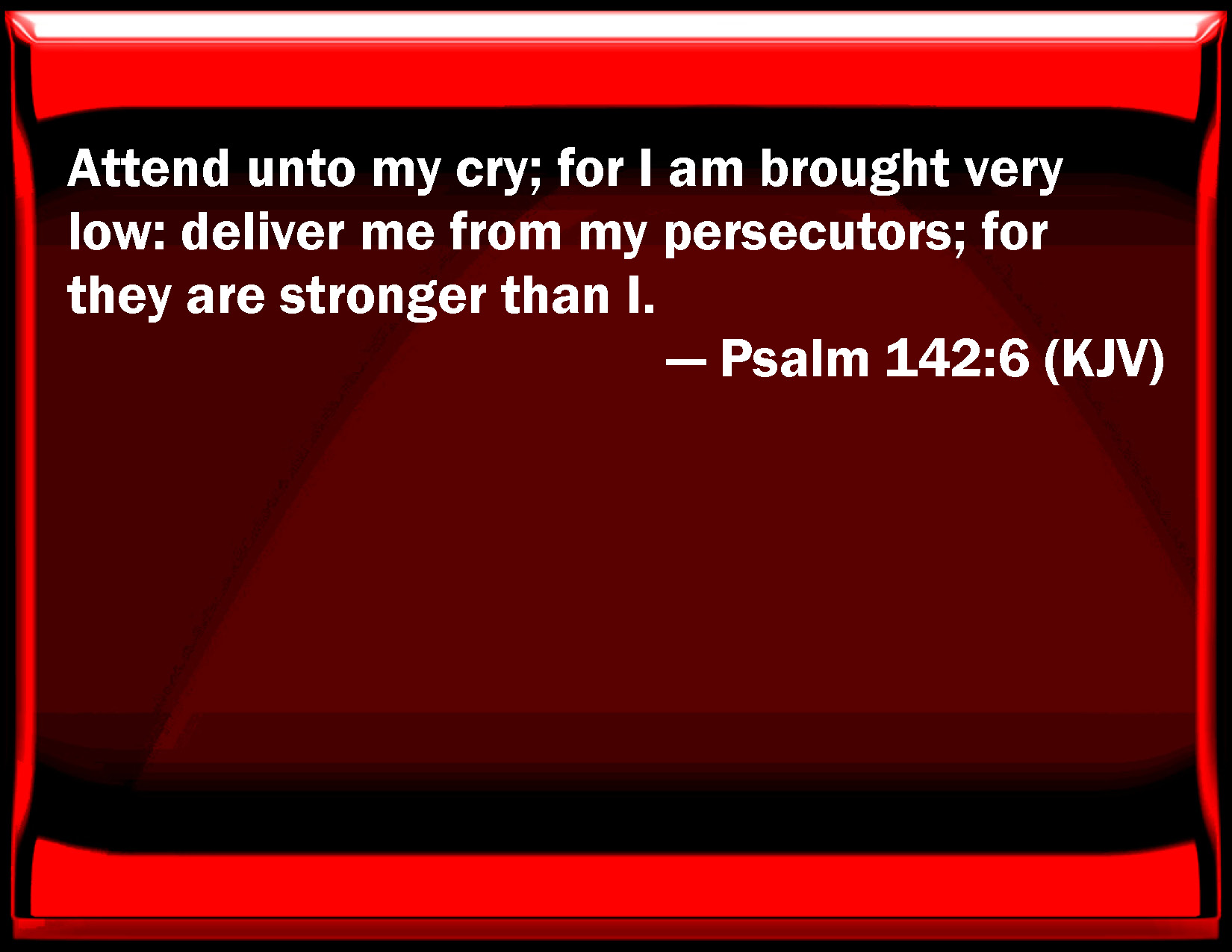 Psalm 142:6 Attend to my cry; for I am brought very low: deliver me from my persecutors; for they are stronger than I.