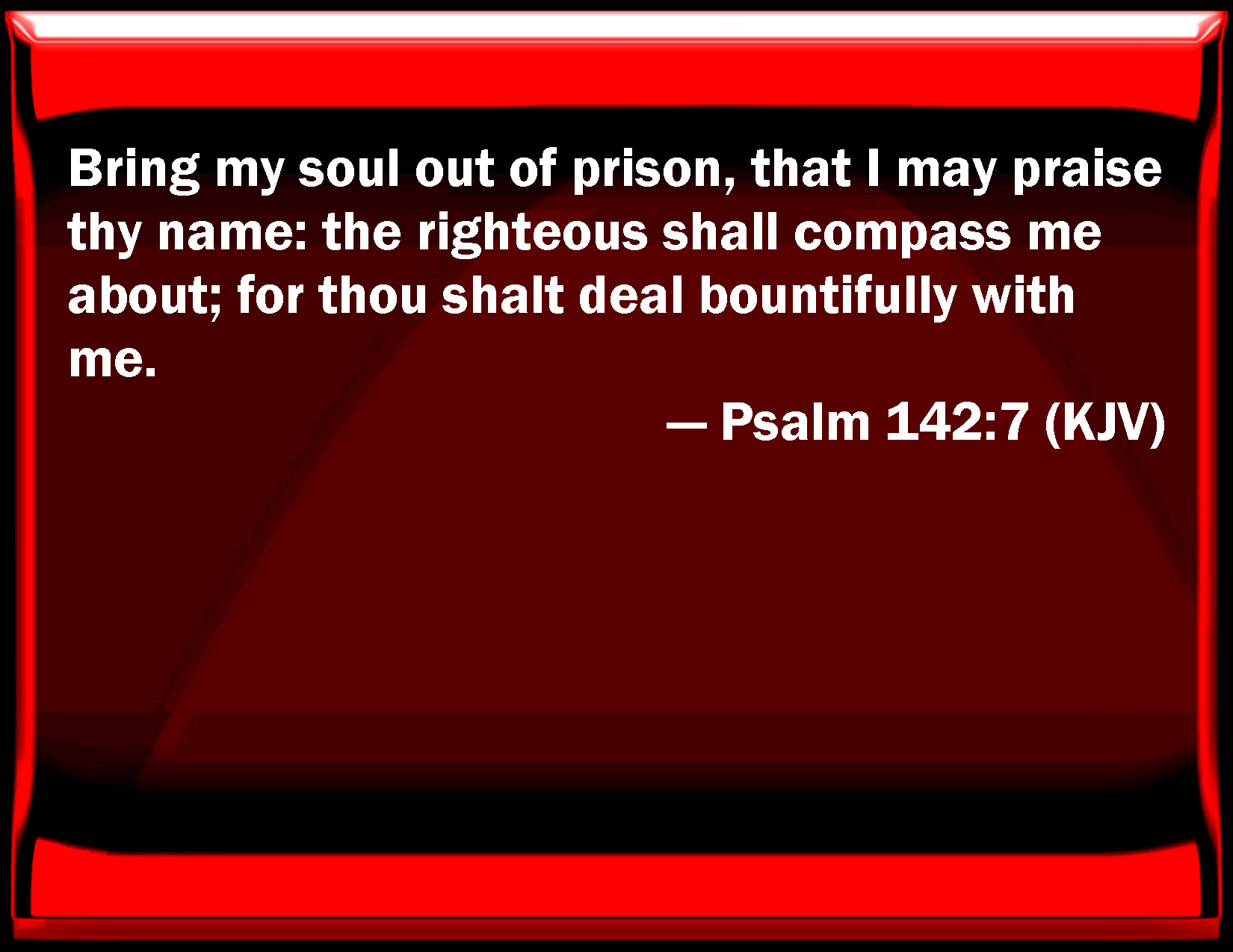 Bible Verse Slide Psalm 142:7 Bring my soul out of prison, that I may praise your name: the righteous shall compass me about; for you shall deal bountifully with me. KJV: Bring my soul out of prison, that I may praise thy name: the righteous shall compass me about; for thou shalt deal bountifully with me. DRB: Bring my soul out of prison, that I may praise thy name: the just wait for me, until thou reward me. DBT: Bring my soul out of prison, that I may celebrate thy name. The righteous shall surround me, because thou dealest bountifully with me. ERV: Bring my soul out of prison, that I may give thanks unto thy name: the righteous shall compass me about; for thou shalt deal bountifully with me. WBT: Bring my soul out of prison, that I may praise thy name: the righteous shall encompass me; for thou wilt deal bountifully with me. WEB: Bring my soul out of prison, that I may give thanks to your name. The righteous will surround me, for you will be good to me. A Psalm by David. YLT: Bring forth from prison my soul to confess Thy name, The righteous do compass me about, When Thou conferrest benefits upon me!Links Psalm 142:7 NIV • Psalm 142:7 NLT • Psalm 142:7 ESV • Psalm 142:7 NASB • Psalm 142:7 KJV • Psalm 142:7 Interlinear • Psalm 142:7 Commentaries • Psalm 142:7 Parallel Texts • Psalm 142:7 Bible Apps • Psalm 142:7 Parallel • Bible Hub |