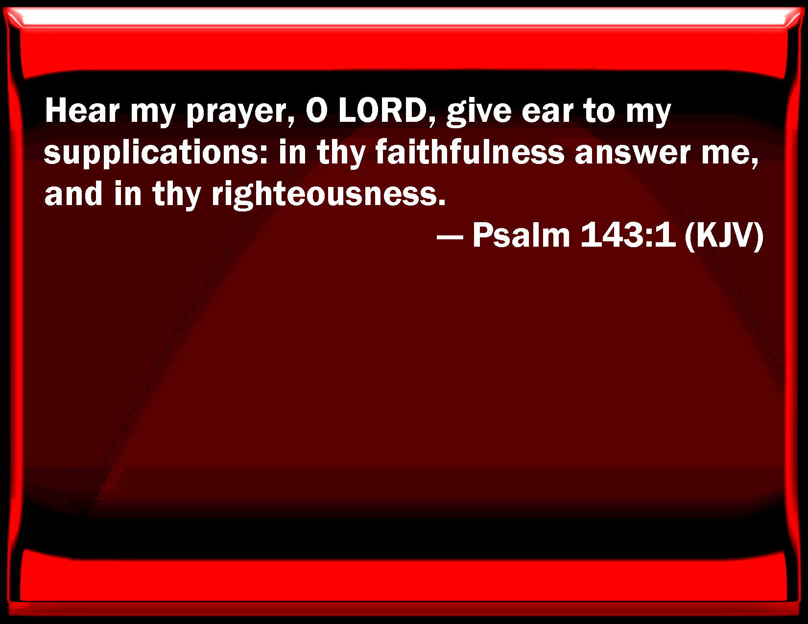 Bible Verse Slide Psalm 143:1 Hear my prayer, O LORD, give ear to my supplications: in your faithfulness answer me, and in your righteousness. KJV: {A Psalm of David.} Hear my prayer, O LORD, give ear to my supplications: in thy faithfulness answer me, and in thy righteousness. DRB: Hear, O Lord, my prayer: give ear to my supplication in thy truth: hear me in thy justice. DBT: {A Psalm of David.} Jehovah, hear my prayer; give ear to my supplications: in thy faithfulness answer me, in thy righteousness. ERV: A Psalm of David. Hear my prayer, O LORD; give ear to my supplications: in thy faithfulness answer me, and in thy righteousness. WBT: A Psalm of David. Hear my prayer, O LORD, give ear to my supplications: in thy faithfulness answer me, and in thy righteousness. WEB: Hear my prayer, Yahweh. Listen to my petitions. In your faithfulness and righteousness, relieve me. YLT: A Psalm of David. O Jehovah, hear my prayer, Give ear unto my supplications, In Thy faithfulness answer me — in Thy righteousness.Links Psalm 143:1 NIV • Psalm 143:1 NLT • Psalm 143:1 ESV • Psalm 143:1 NASB • Psalm 143:1 KJV • Psalm 143:1 Interlinear • Psalm 143:1 Commentaries • Psalm 143:1 Parallel Texts • Psalm 143:1 Bible Apps • Psalm 143:1 Parallel • Bible Hub |