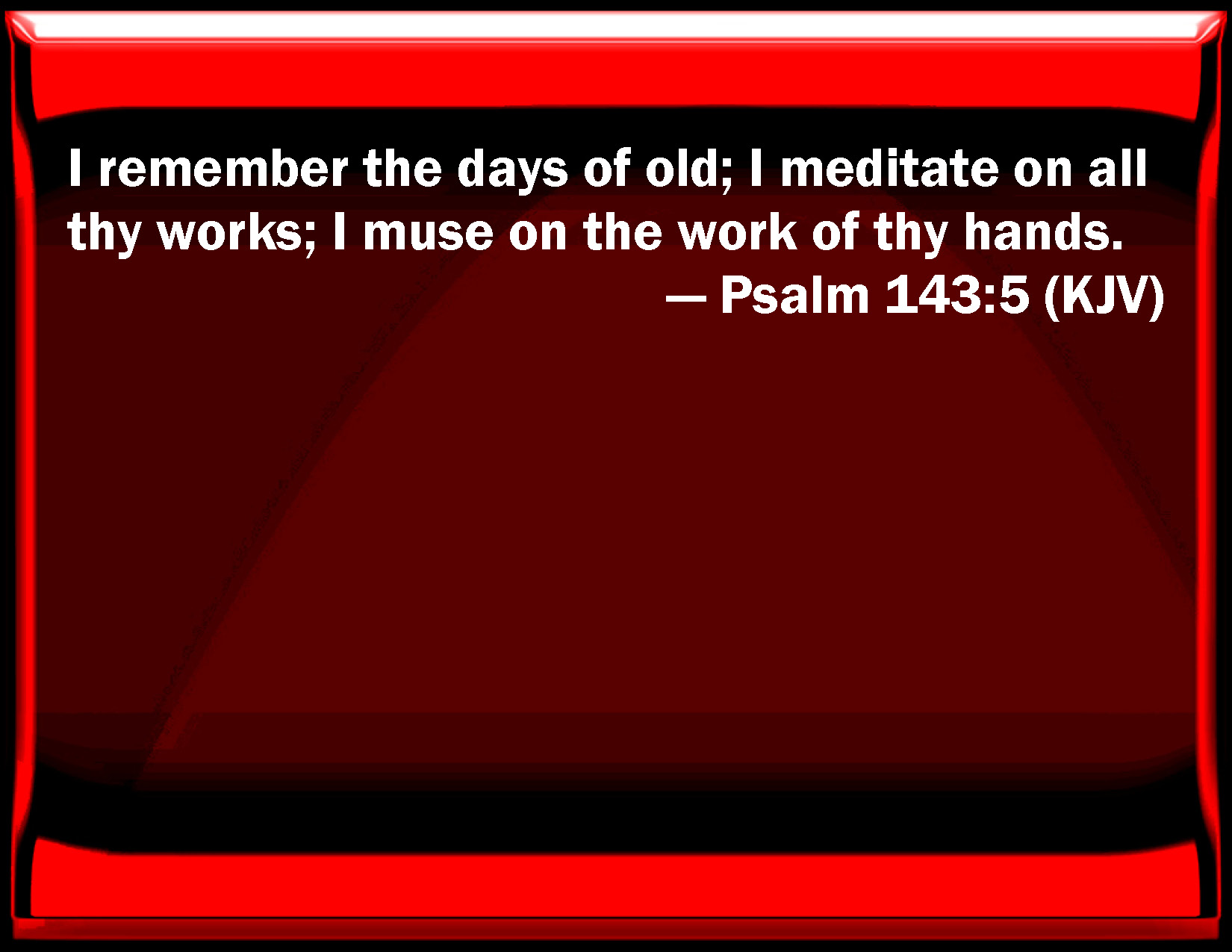 Psalm 143:5 I remember the days of old; I meditate on all your works; I muse on the work of your hands.