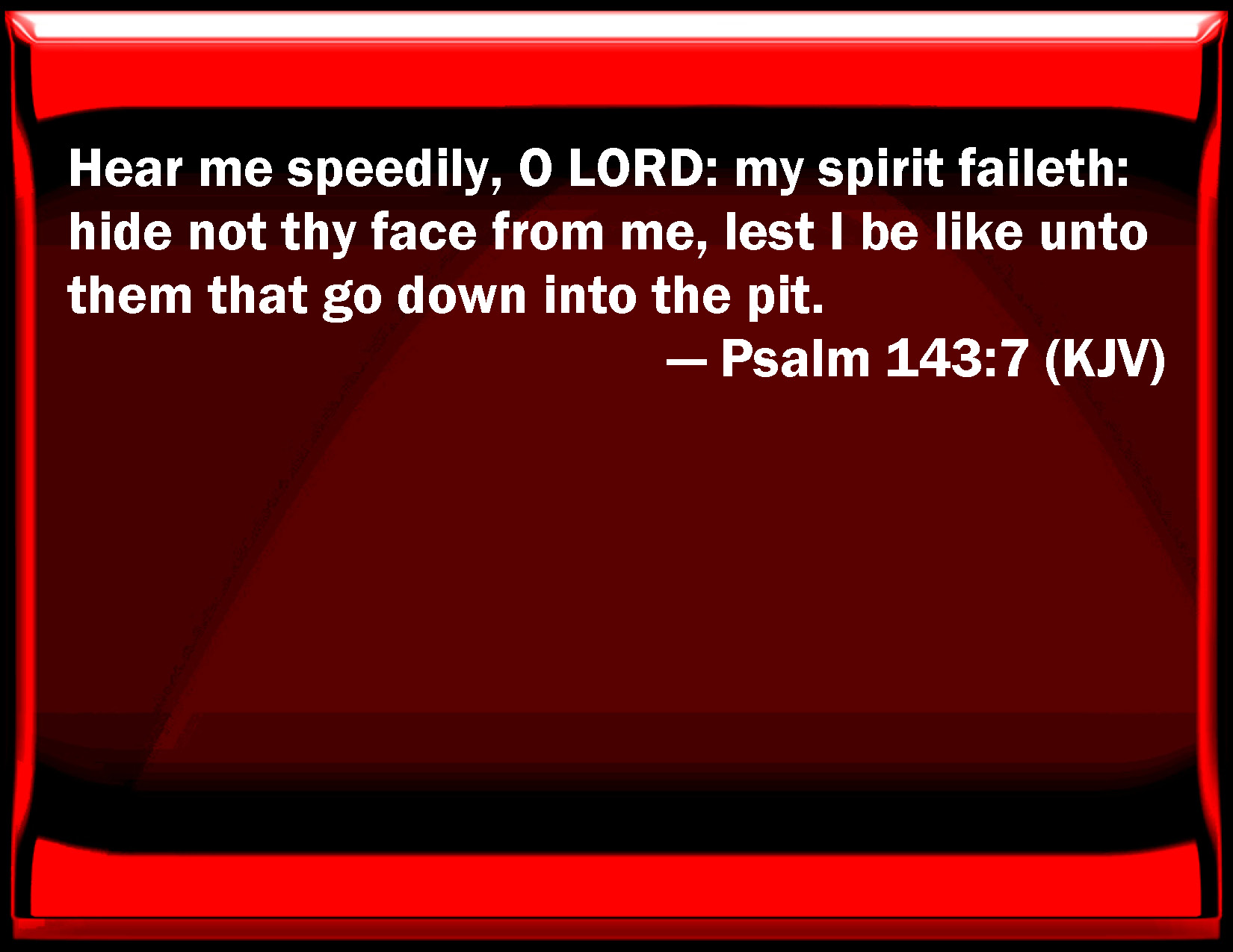 Bible Verse Slide Psalm 143:7 Hear me speedily, O LORD: my spirit fails: hide not your face from me, lest I be like to them that go down into the pit. KJV: Hear me speedily, O LORD: my spirit faileth: hide not thy face from me, lest I be like unto them that go down into the pit. DRB: Hear me speedily, O Lord: my spirit hath fainted away. Turn not away thy face from me, lest I be like unto them that go down into the pit. DBT: Answer me speedily, O Jehovah; my spirit faileth: hide not thy face from me, or I shall be like unto them that go down into the pit. ERV: Make haste to answer me, O LORD; my spirit faileth: hide not thy face from me; lest I become like them that go down into the pit. WBT: Hear me speedily, O LORD: my spirit faileth: hide not thy face from me, lest I be like them that go down into the pit. WEB: Hurry to answer me, Yahweh. My spirit fails. Don't hide your face from me, so that I don't become like those who go down into the pit. YLT: Haste, answer me, O Jehovah, My spirit hath been consumed, Hide not Thou Thy face from me, Or I have been compared with those going down to the pit.Links Psalm 143:7 NIV • Psalm 143:7 NLT • Psalm 143:7 ESV • Psalm 143:7 NASB • Psalm 143:7 KJV • Psalm 143:7 Interlinear • Psalm 143:7 Commentaries • Psalm 143:7 Parallel Texts • Psalm 143:7 Bible Apps • Psalm 143:7 Parallel • Bible Hub |