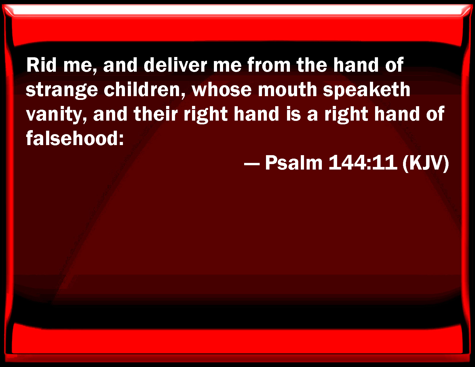 Bible Verse Slide Psalm 144:11 Rid me, and deliver me from the hand of strange children, whose mouth speaks vanity, and their right hand is a right hand of falsehood: KJV: Rid me, and deliver me from the hand of strange children, whose mouth speaketh vanity, and their right hand is a right hand of falsehood: DRB: Deliver me, And rescue me out of the hand of strange children; whose mouth hath spoken vanity: and their right hand is the right hand of iniquity: DBT: Rescue me, and deliver me from the hand of aliens, whose mouth speaketh vanity, and their right hand is a right hand of falsehood. ERV: Rescue me, and deliver me out of the hand of strangers, whose mouth speaketh vanity, and their right hand is a right hand of falsehood. WBT: Rid me, and deliver me from the hand of strange children, whose mouth speaketh vanity, and their right hand is a right hand of falsehood: WEB: Rescue me, and deliver me out of the hands of foreigners, whose mouths speak deceit, whose right hand is a right hand of falsehood. YLT: Free me, and deliver me From the hand of sons of a stranger, Because their mouth hath spoken vanity, And their right hand is a right hand of falsehood,Links Psalm 144:11 NIV • Psalm 144:11 NLT • Psalm 144:11 ESV • Psalm 144:11 NASB • Psalm 144:11 KJV • Psalm 144:11 Interlinear • Psalm 144:11 Commentaries • Psalm 144:11 Parallel Texts • Psalm 144:11 Bible Apps • Psalm 144:11 Parallel • Bible Hub |